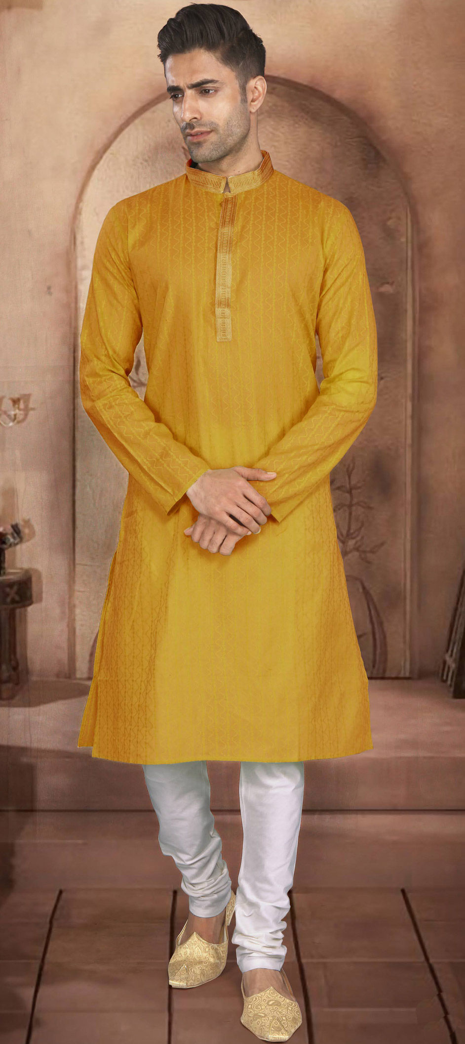 Yellow color Kurta Pyjamas in Cotton fabric with Thread work