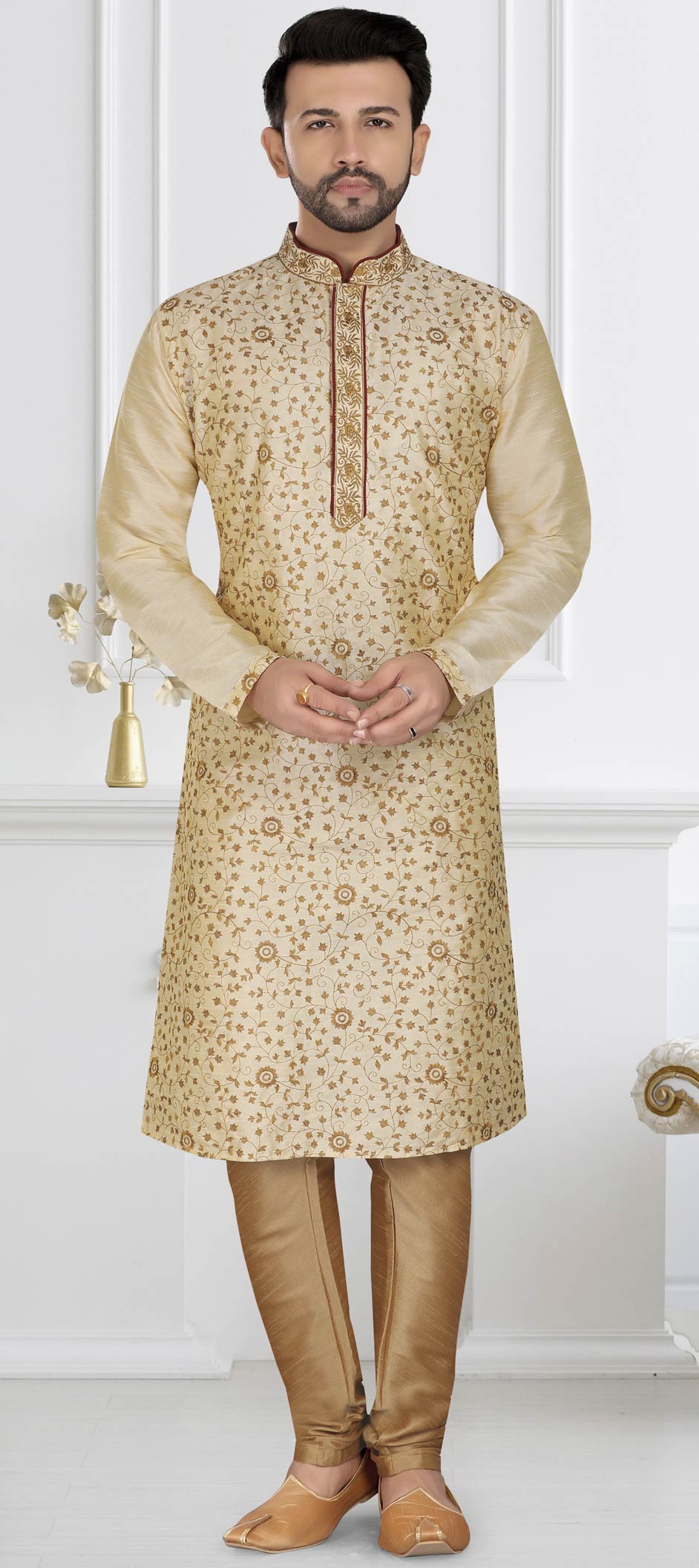 Beige and Brown color Kurta Pyjamas in Dupion Silk fabric with Embroidered, Thread work