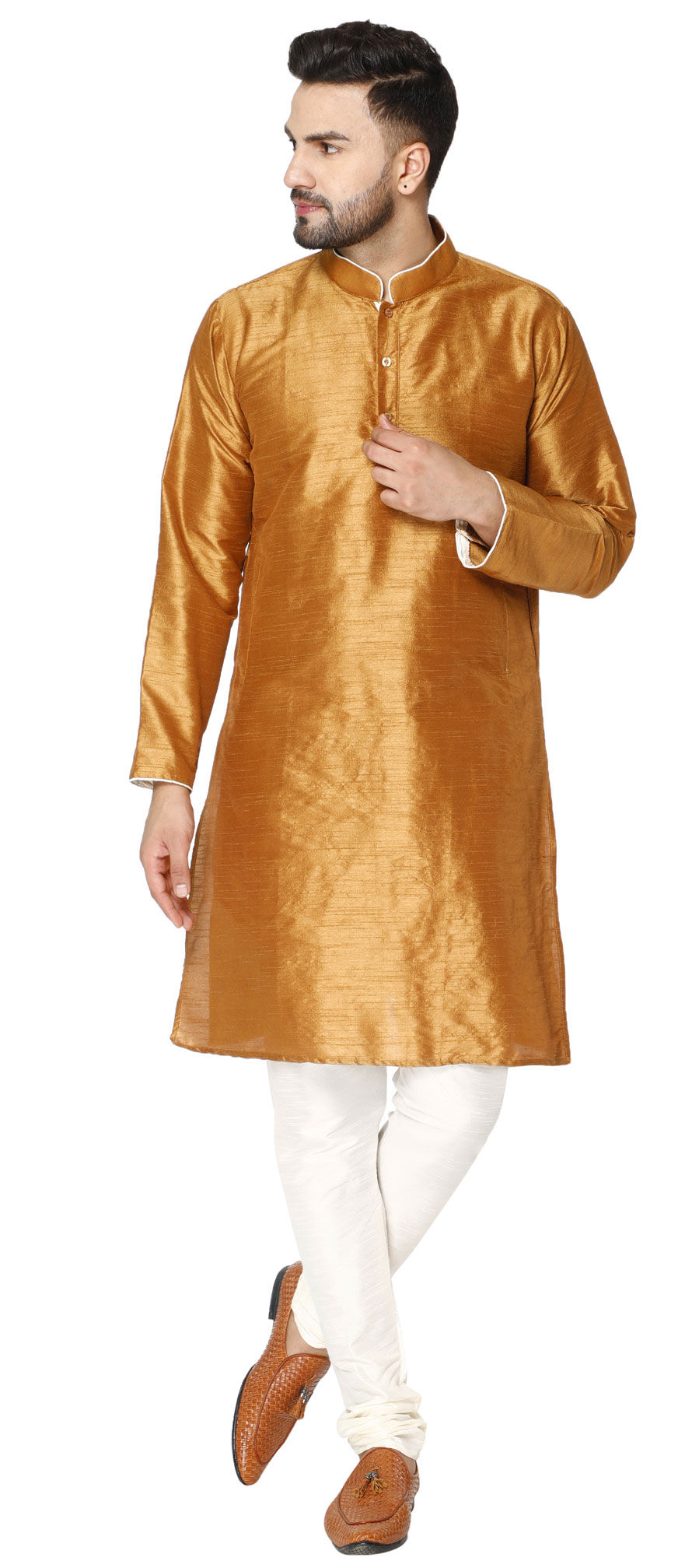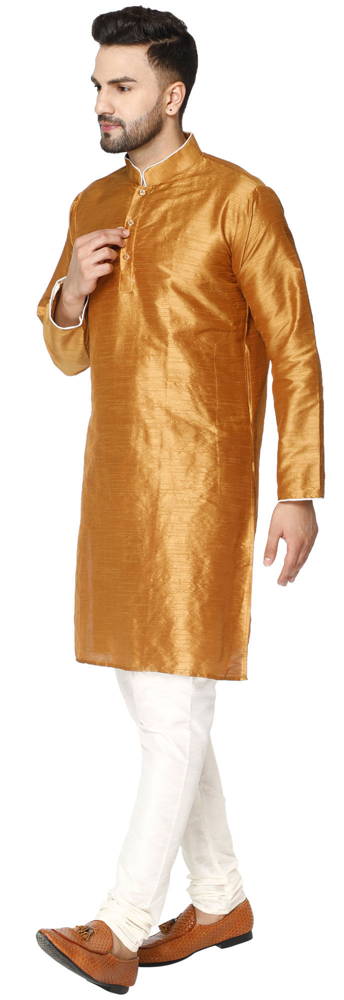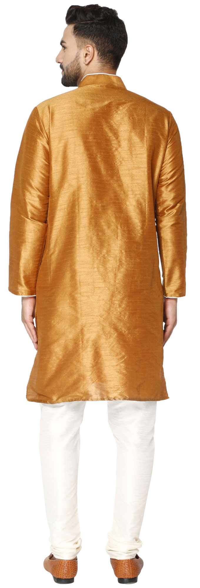 Beige and Brown color Kurta Pyjamas in Dupion Silk fabric with Thread work