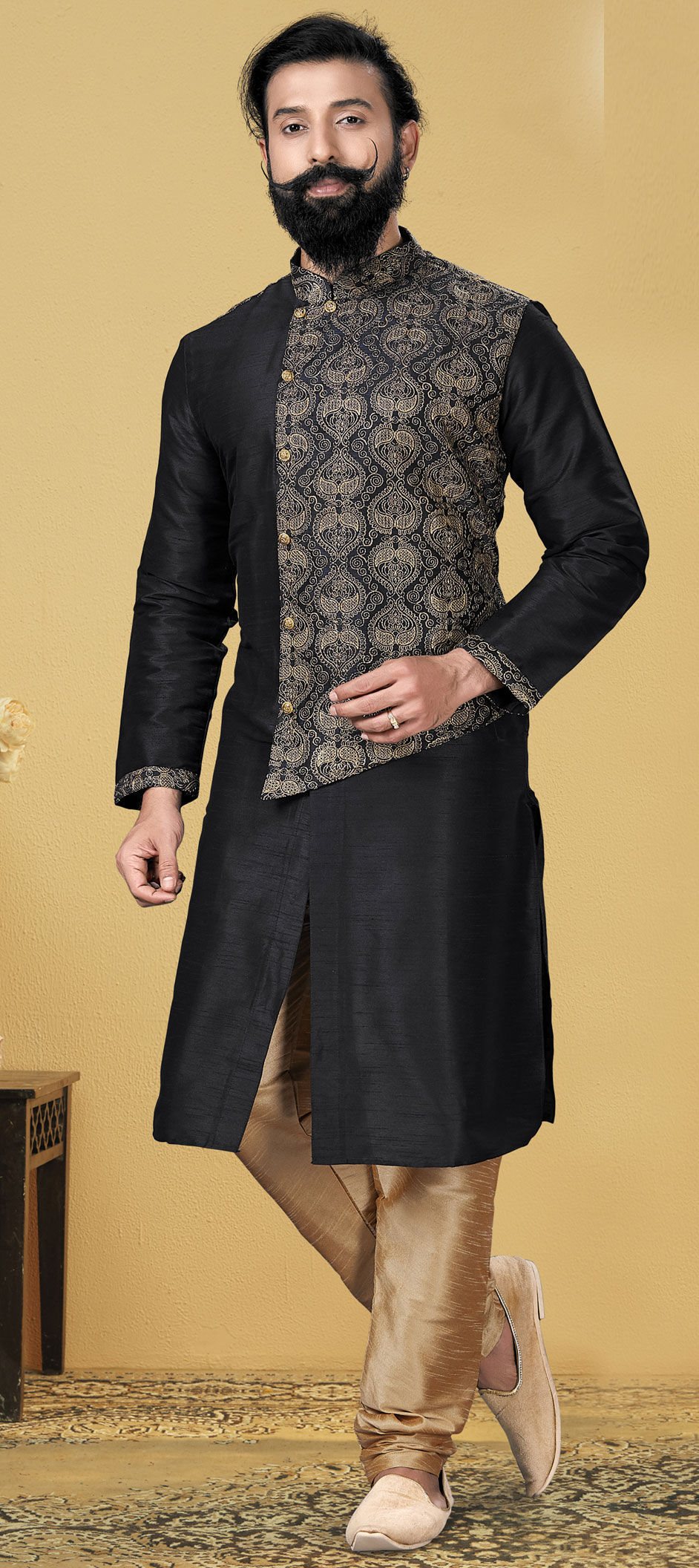 Black and Grey color Kurta Pyjamas in Dupion Silk fabric with Embroidered, Thread work