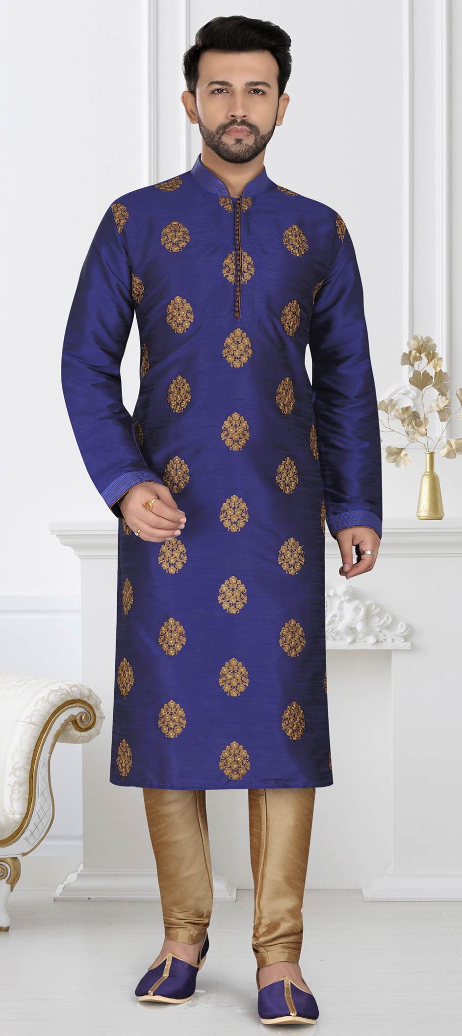Blue color Kurta Pyjamas in Dupion Silk fabric with Embroidered, Thread work