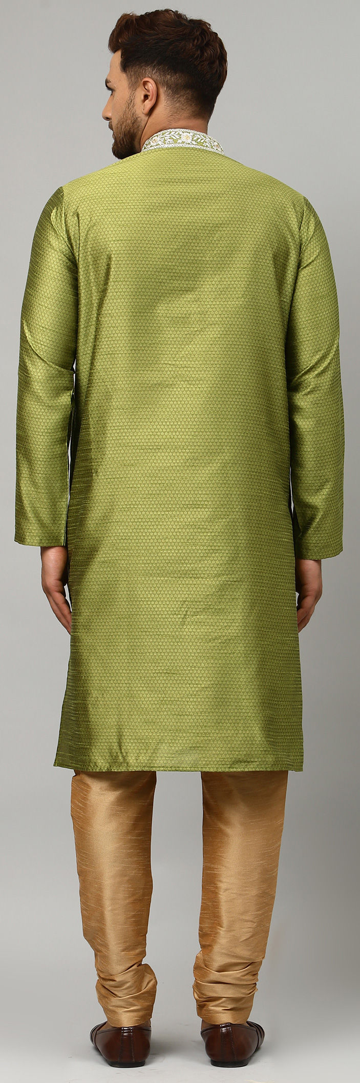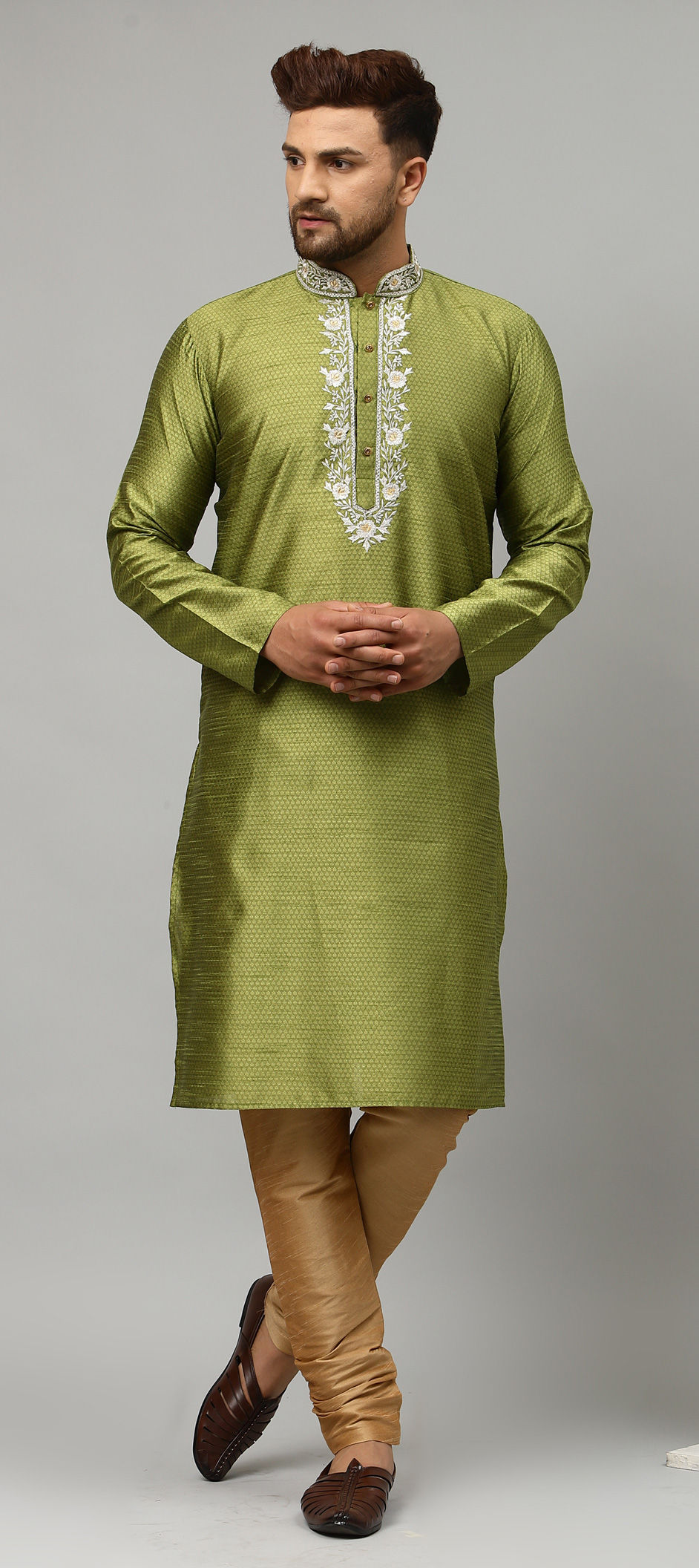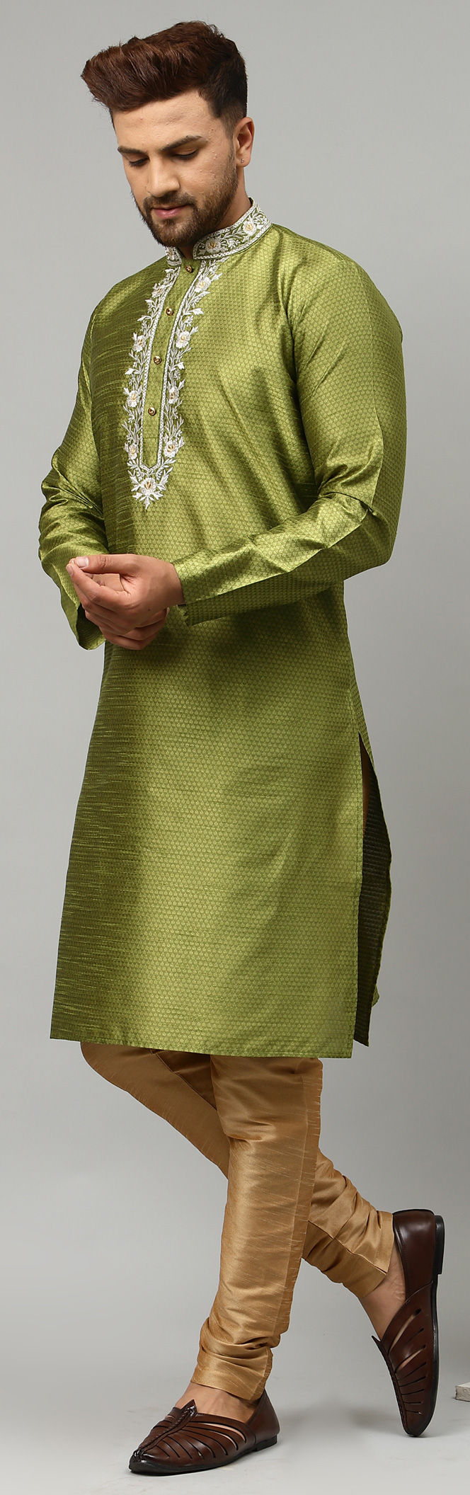 Green color Kurta Pyjamas in Dupion Silk fabric with Embroidered, Thread work