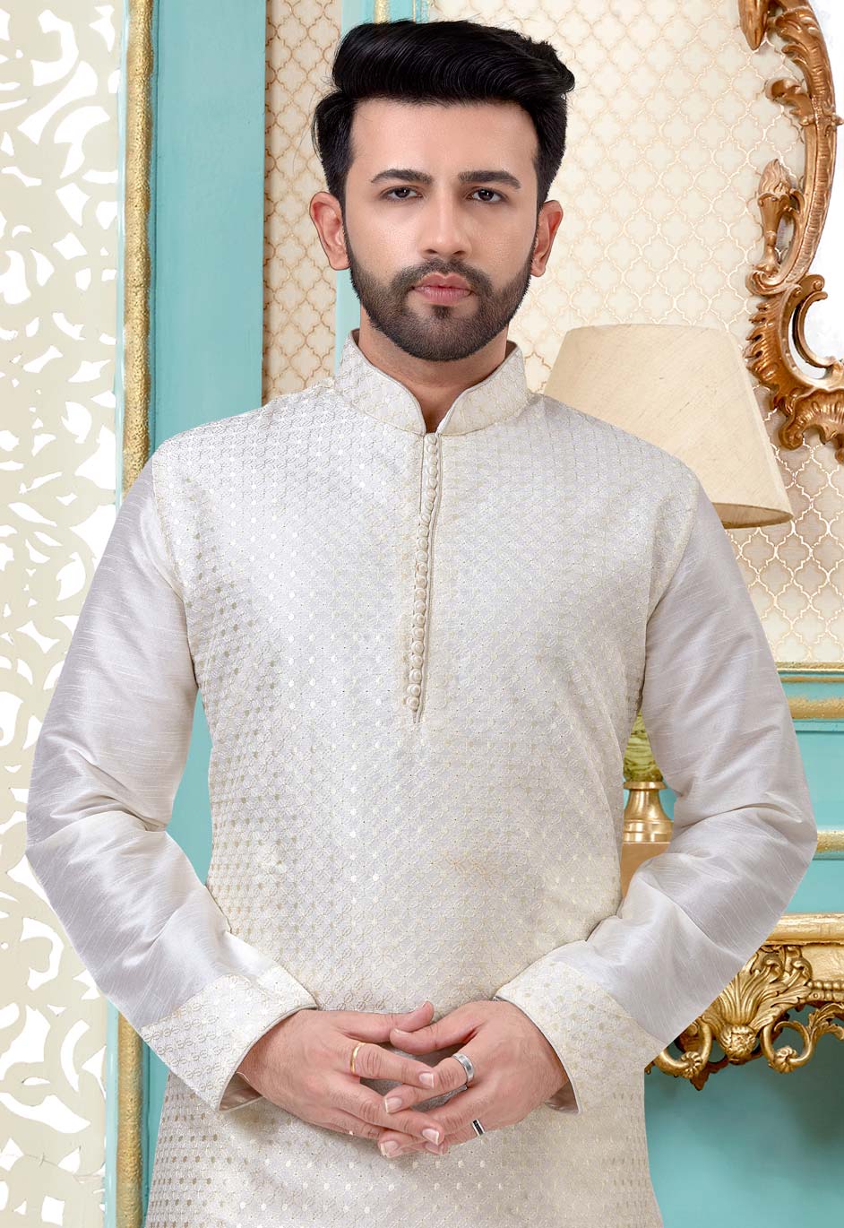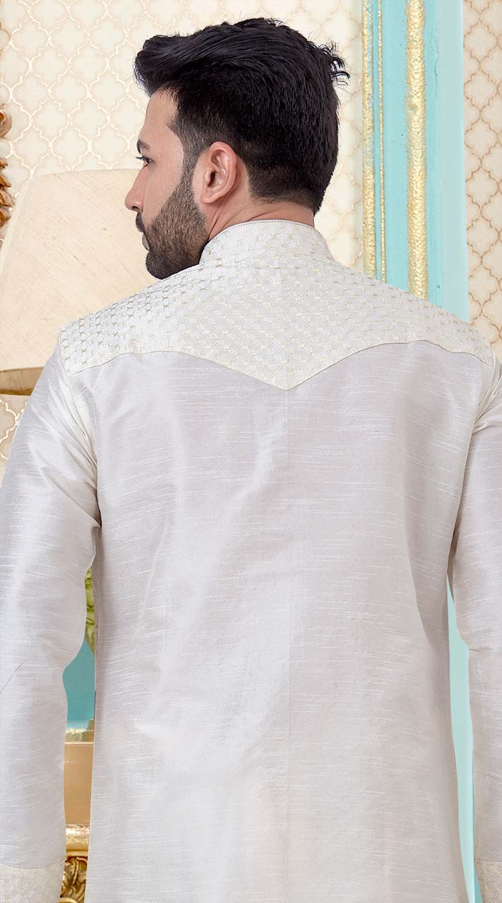 White and Off White color Kurta Pyjamas in Dupion Silk fabric with Embroidered, Resham, Thread work