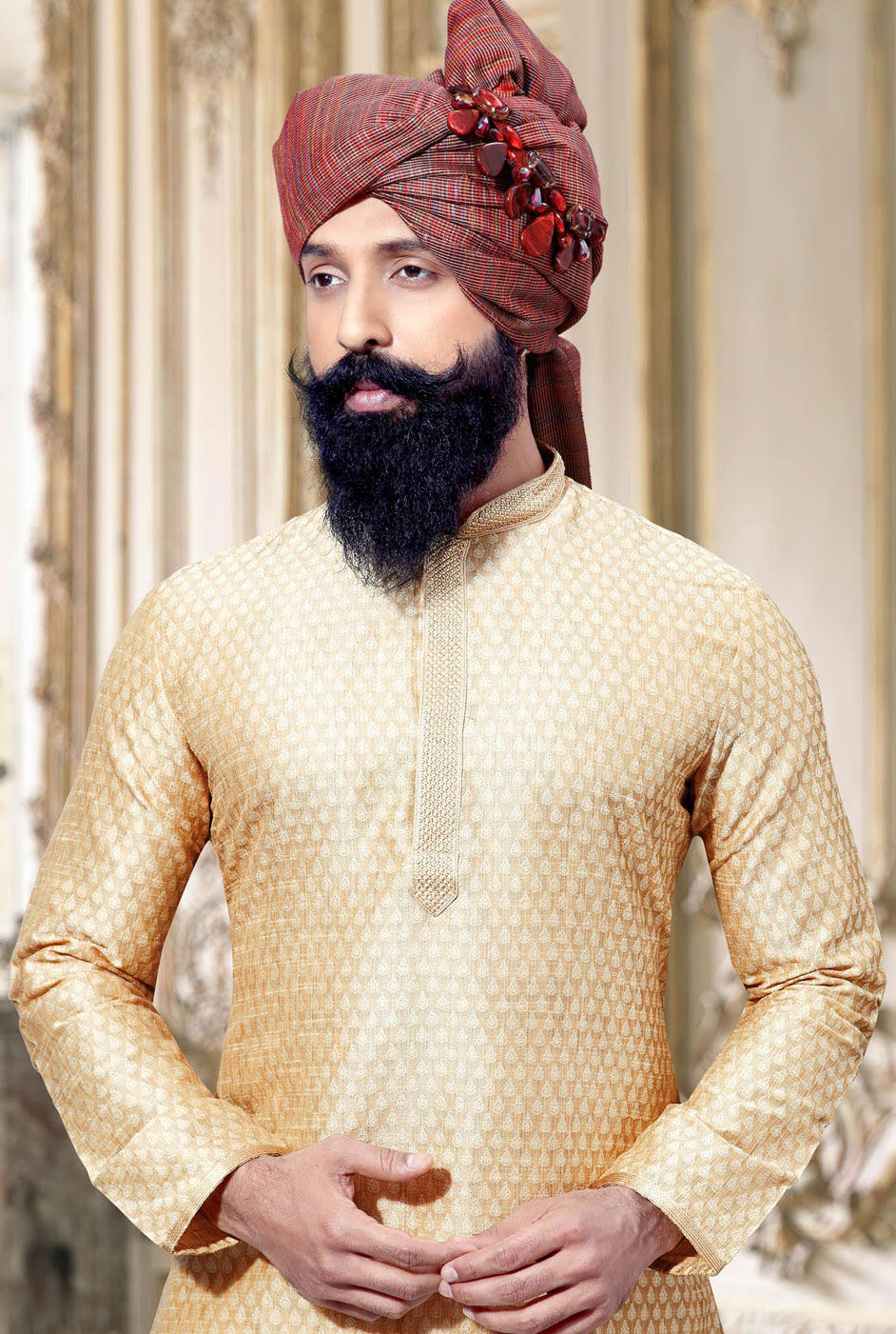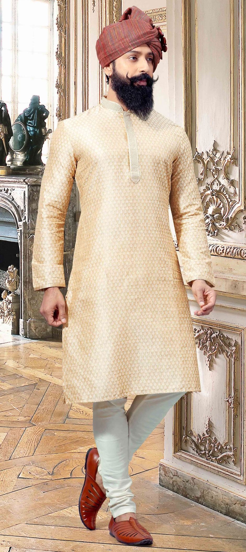 Beige and Brown color Kurta Pyjamas in Jacquard fabric with Lace work