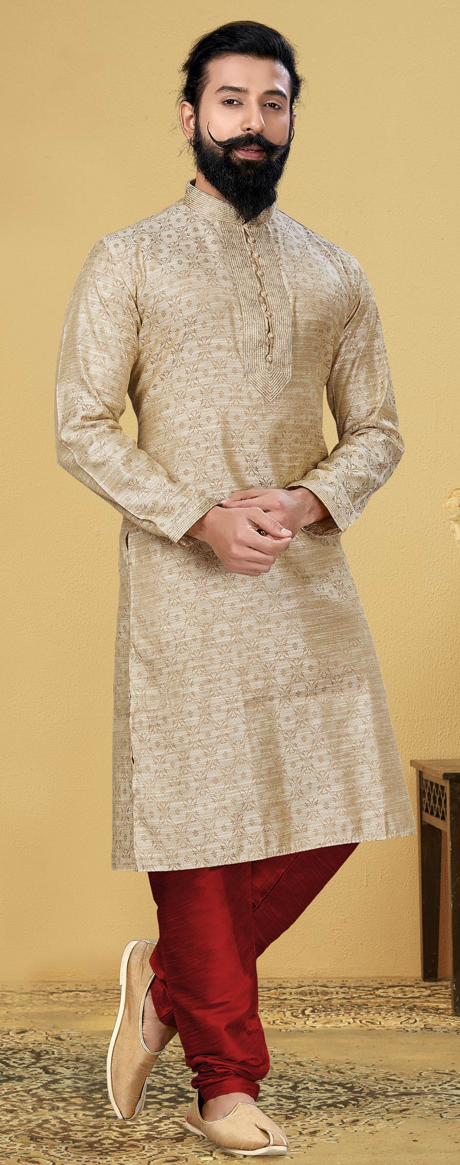 Beige and Brown color Kurta Pyjamas in Jacquard fabric with Thread work