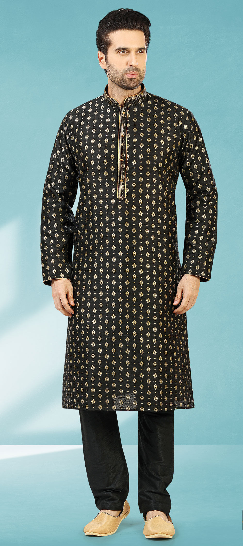Black and Grey color Kurta Pyjamas in Jacquard fabric with Lace work