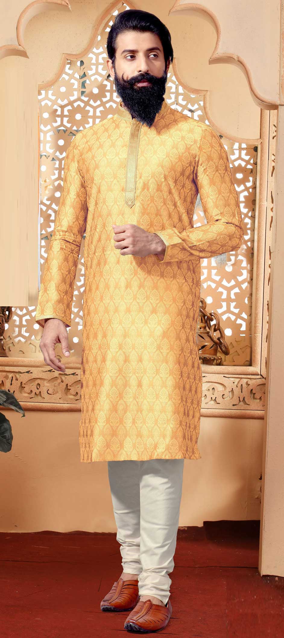 Gold color Kurta Pyjamas in Jacquard fabric with Weaving work