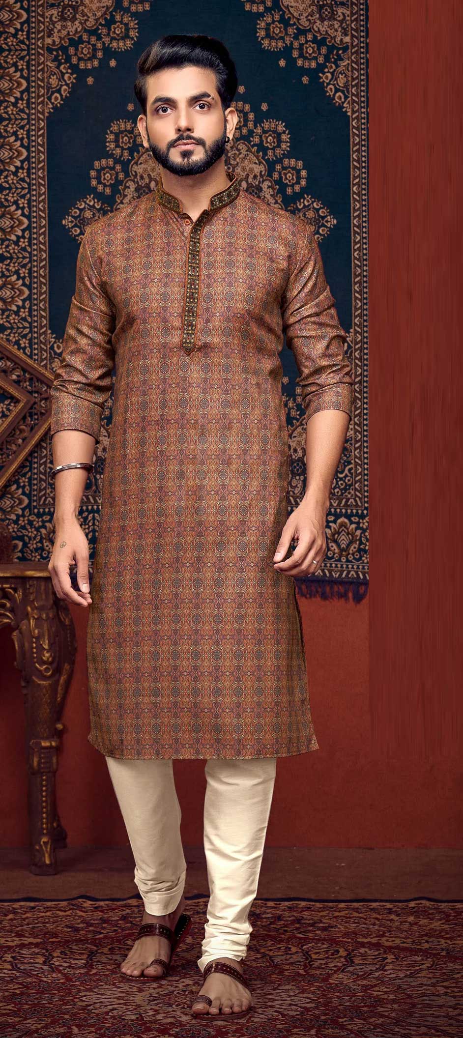 Beige and Brown color Kurta Pyjamas in Poly cotton fabric with Digital Print work