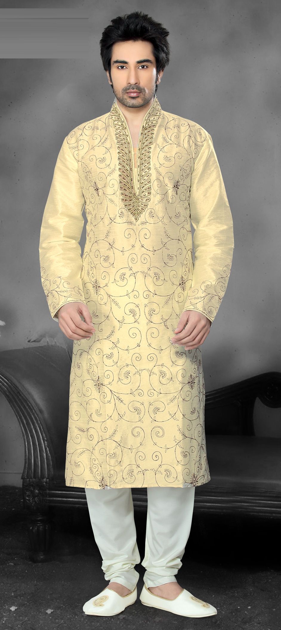 White and Off White color Kurta Pyjamas in Raw Dupion Silk fabric with Stone, Thread work
