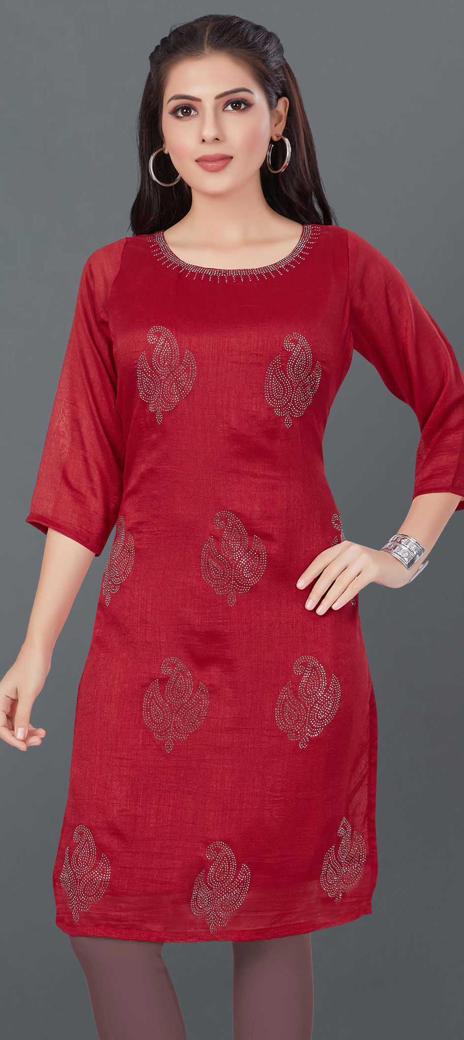 Red and Maroon color Kurti in Art Silk fabric with Stone work