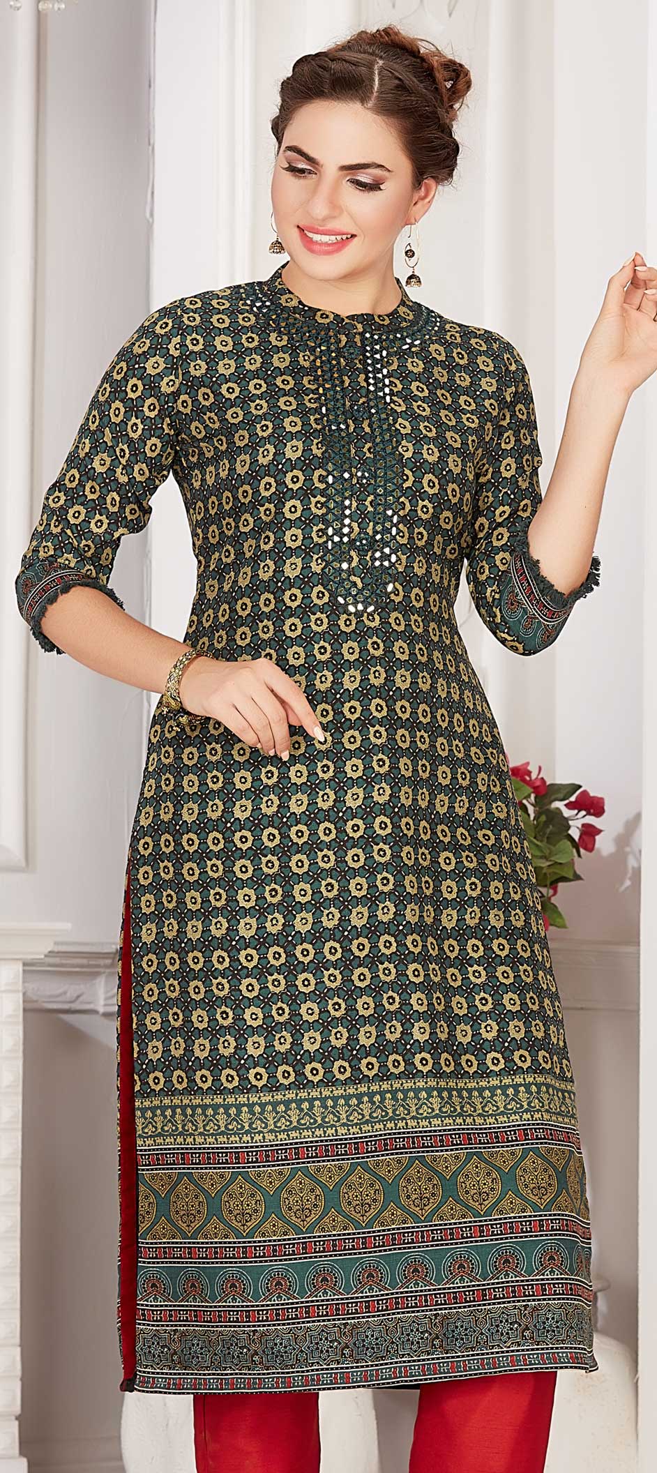 Blue color Kurti in Art Silk fabric with Digital Print, Mirror work