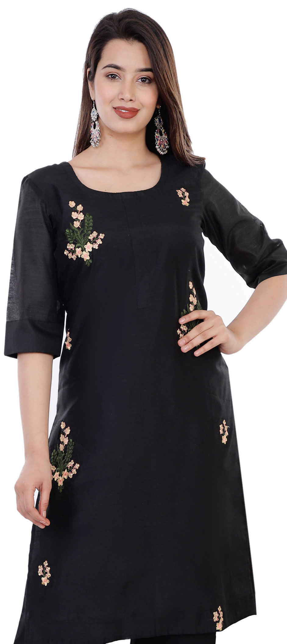 Black and Grey color Kurti in Chanderi Silk fabric with Embroidered, Thread work