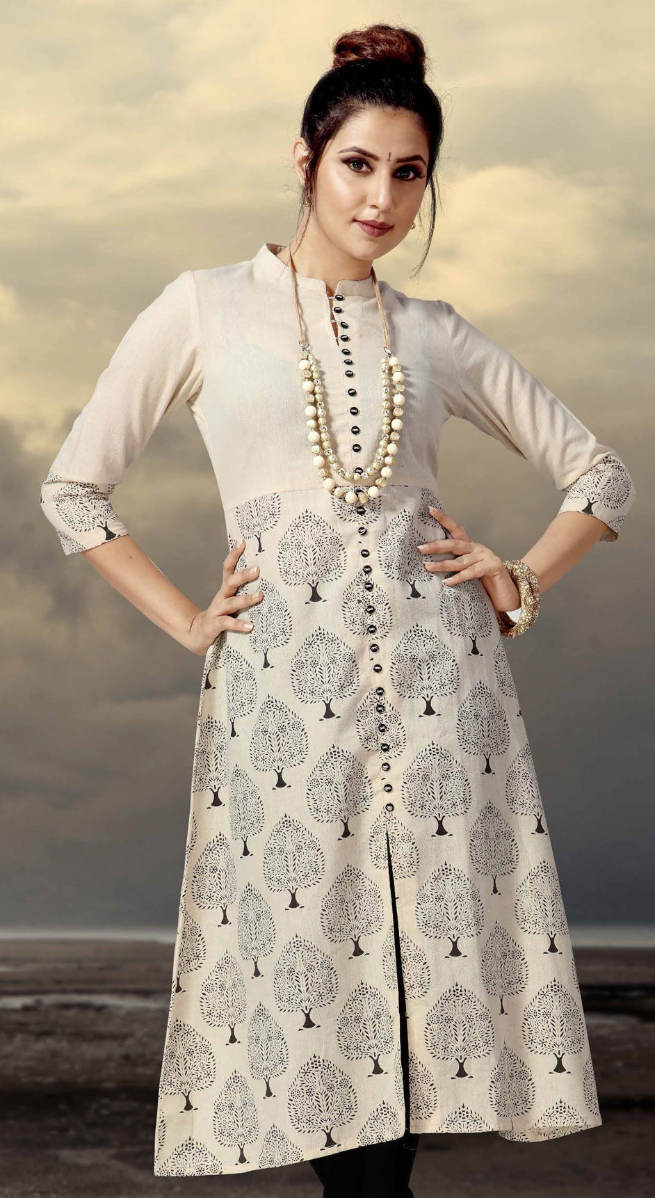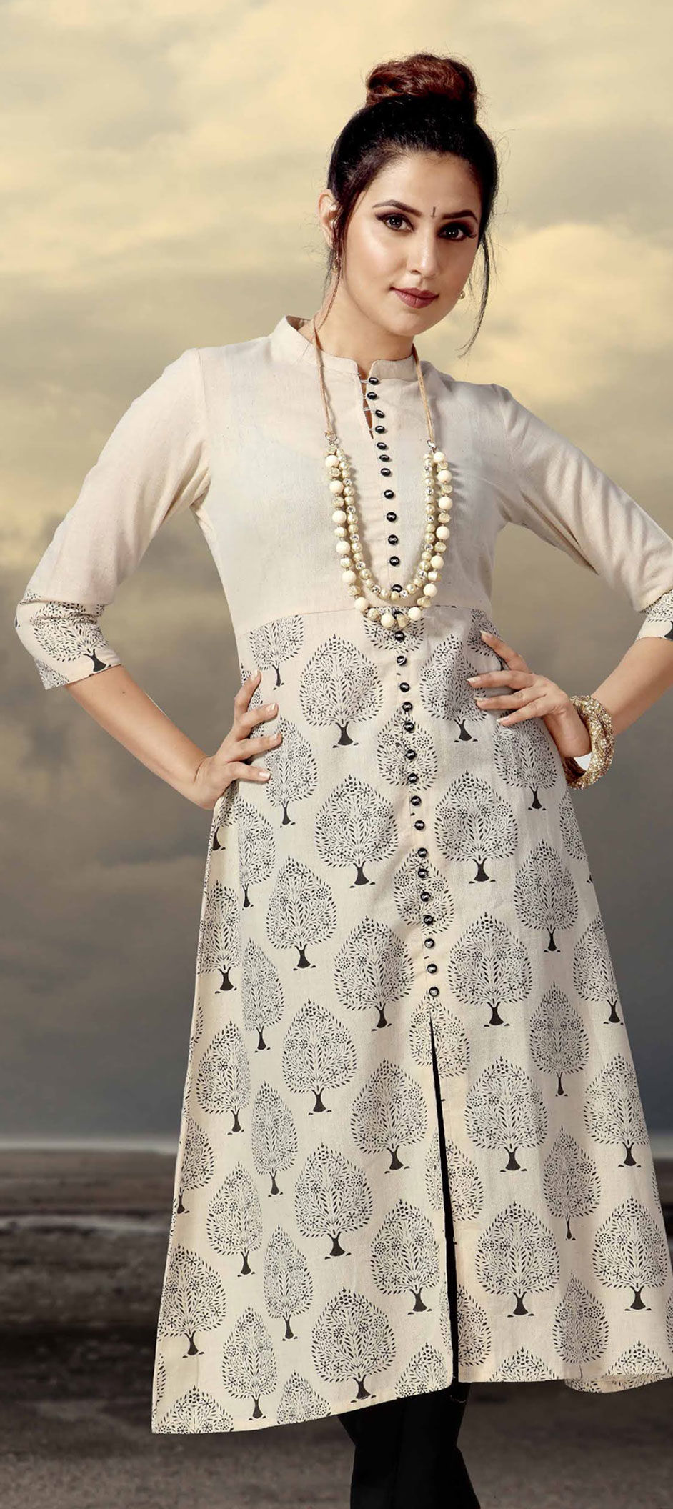 in Beige and Brown with Printed work