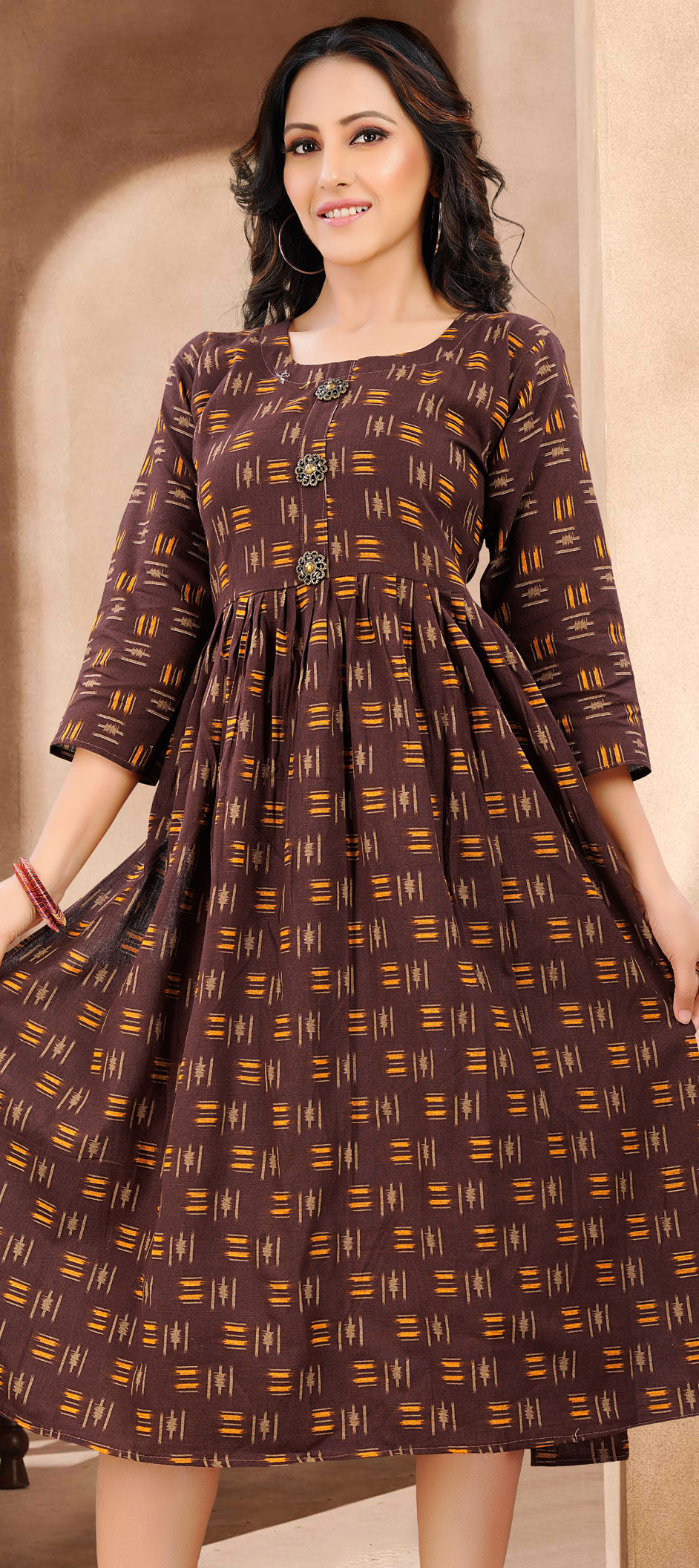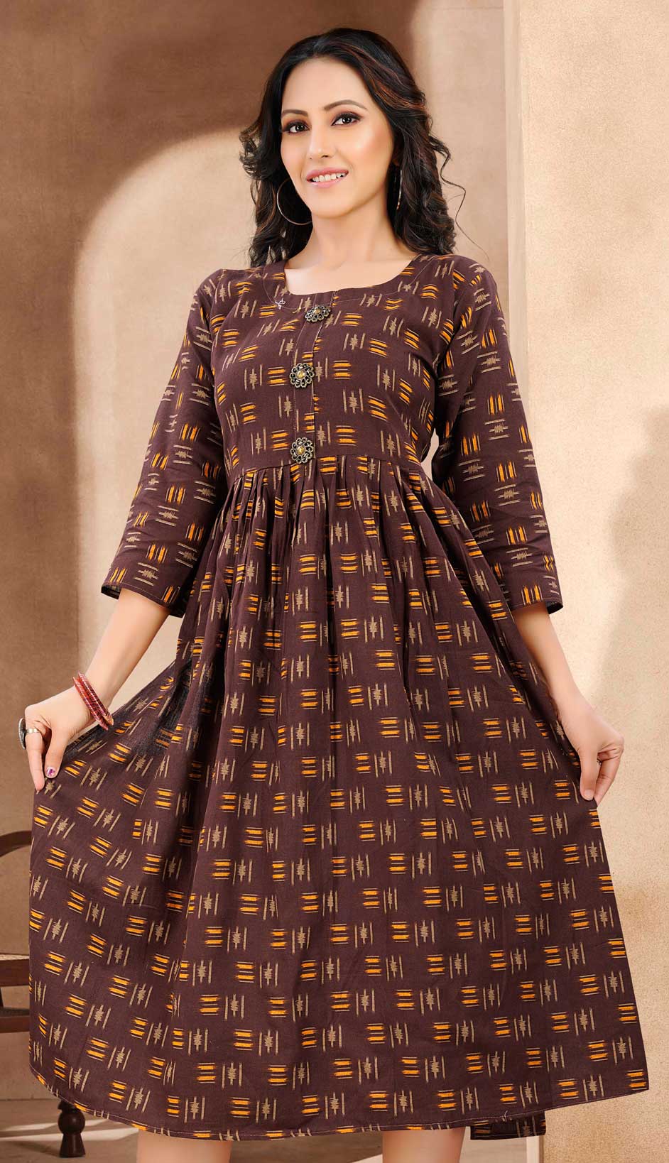 in Beige and Brown with Printed work