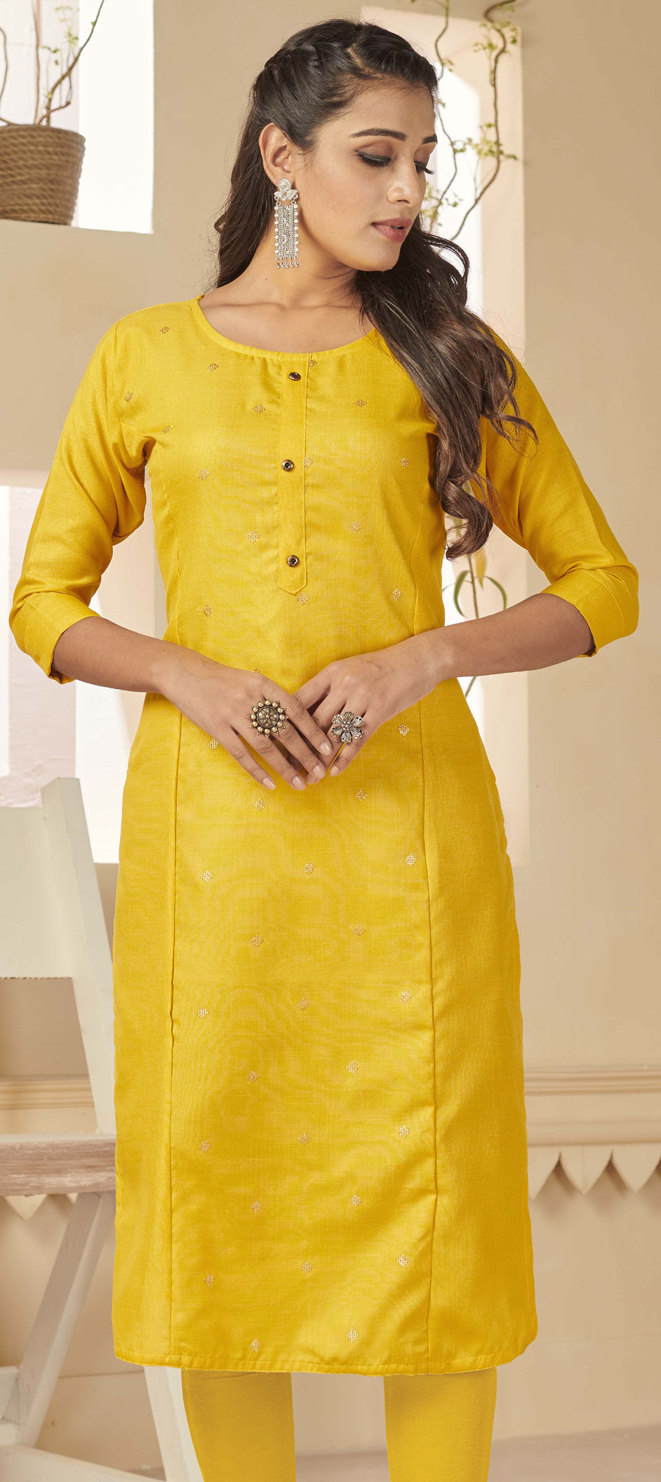 Yellow color Kurti in Cotton fabric with Sequence, Thread work