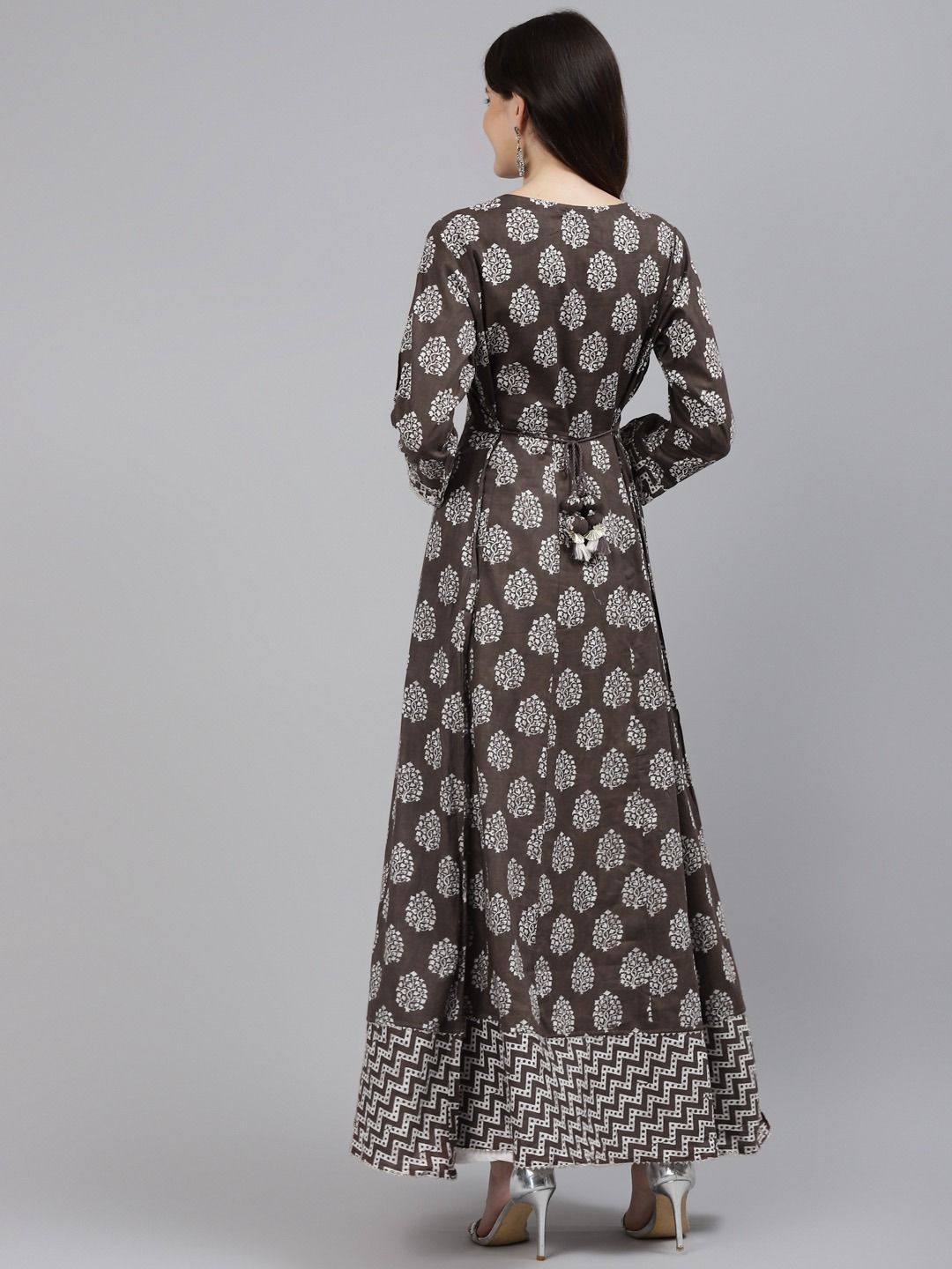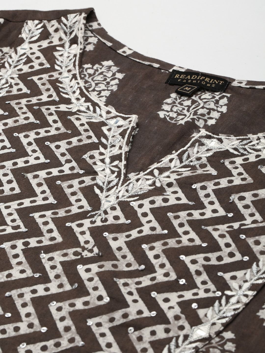 Beige and Brown color Kurti in Cotton fabric with Embroidered, Printed, Sequence, Zari work
