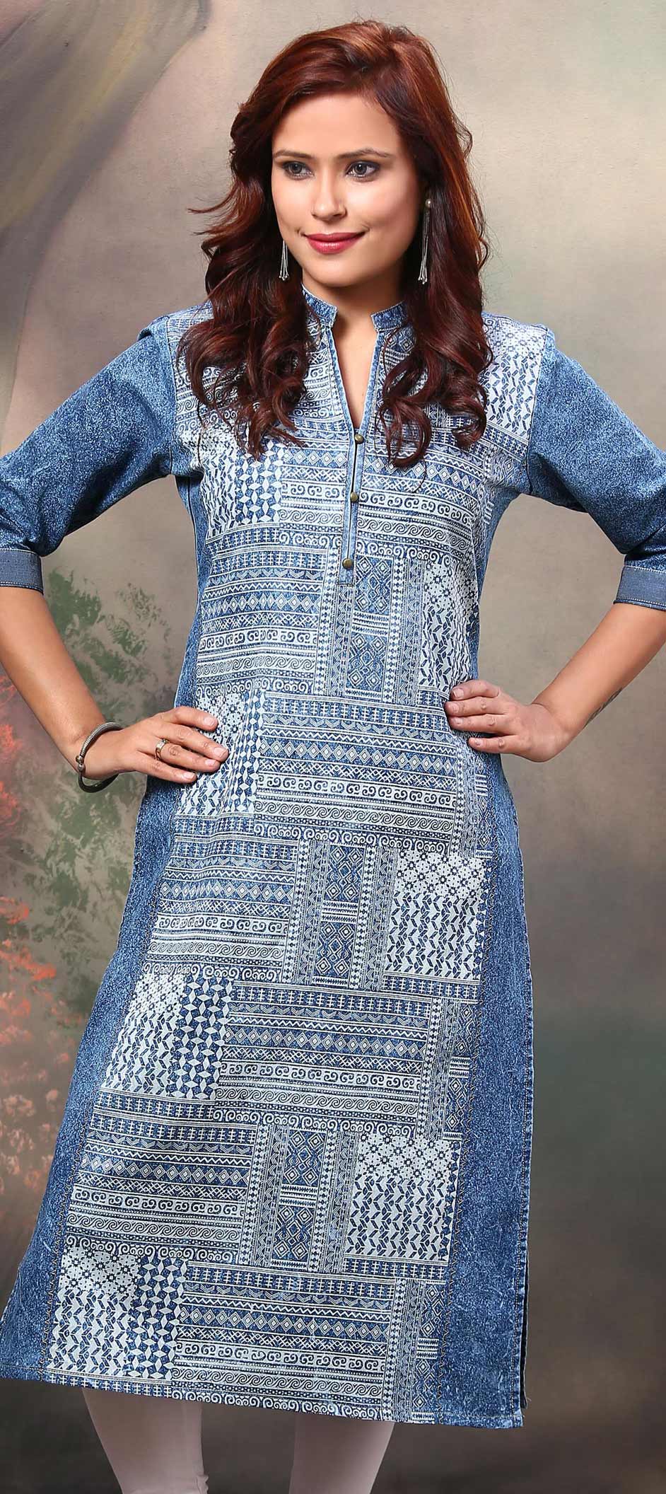 Blue color Kurti in Denim fabric with Printed work