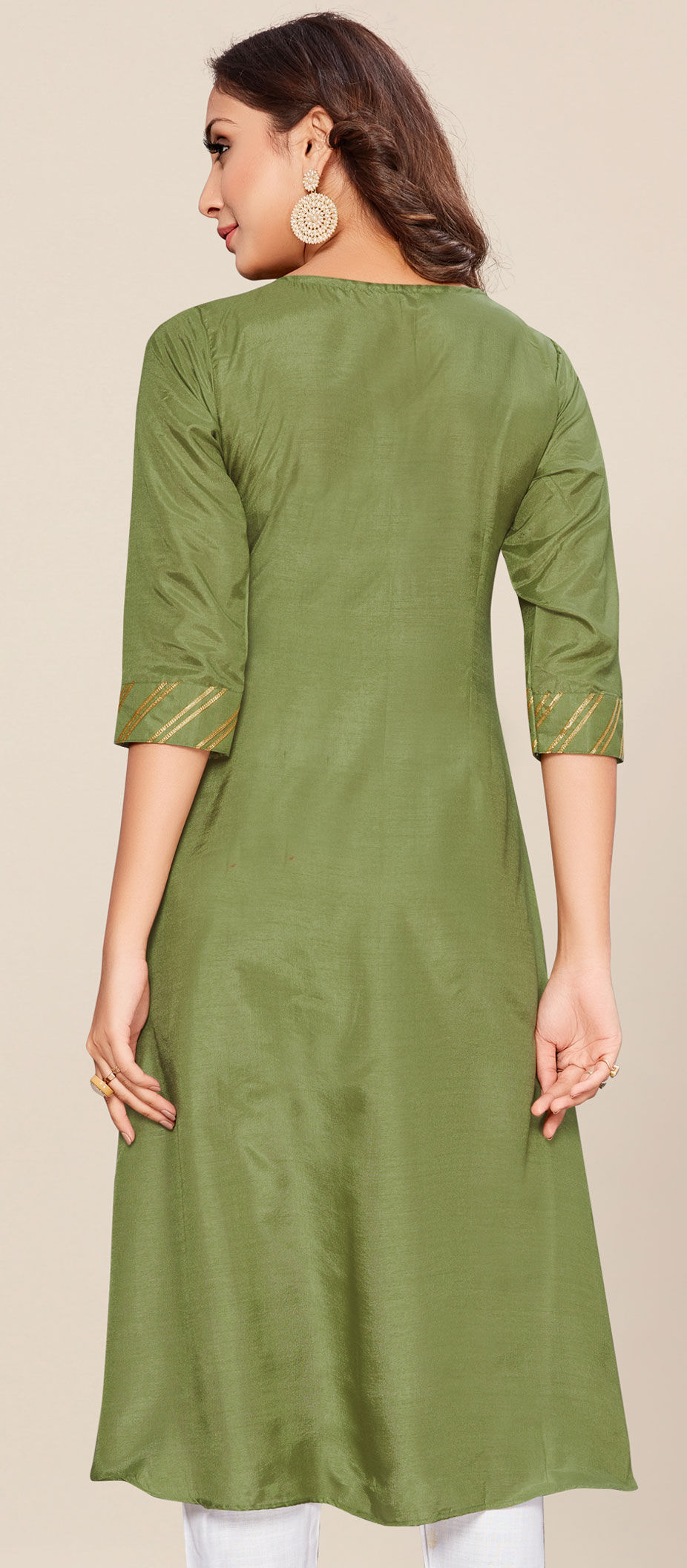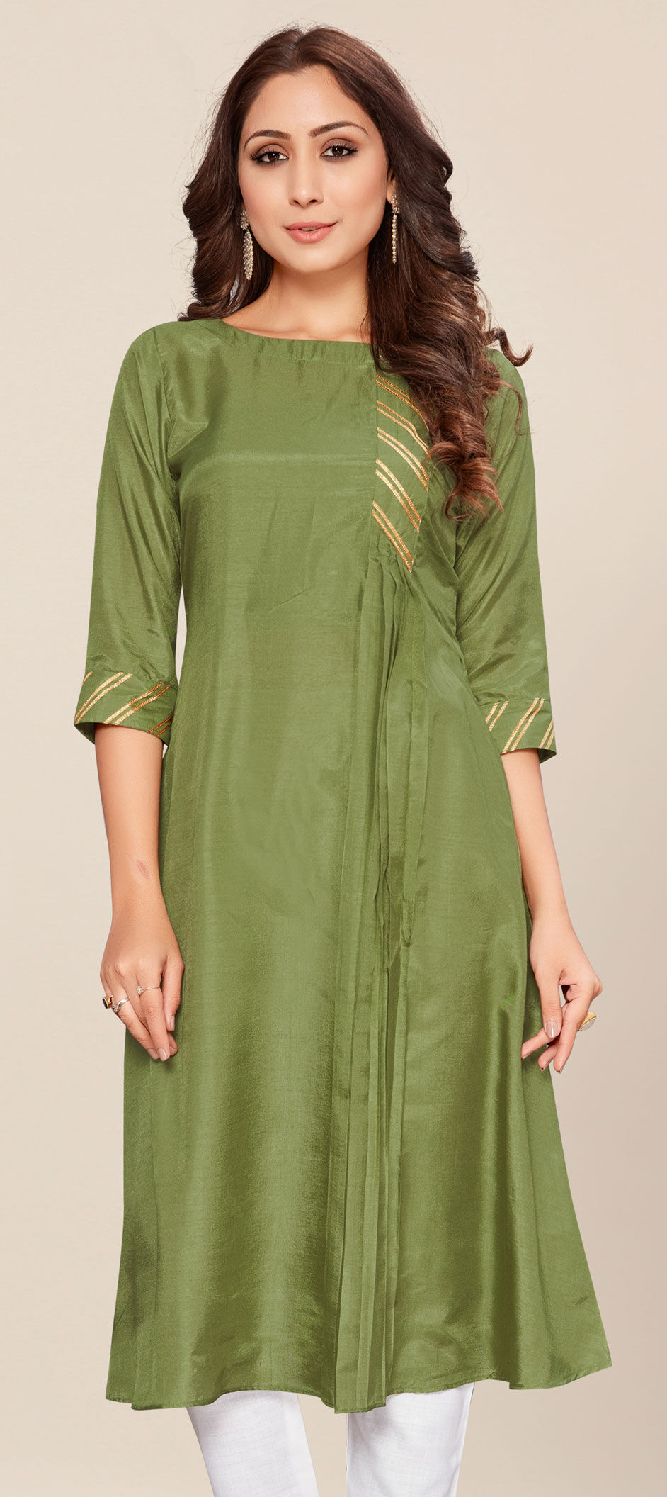 Green color Kurti in Dolla Silk fabric with Gota Patti, Pleats work