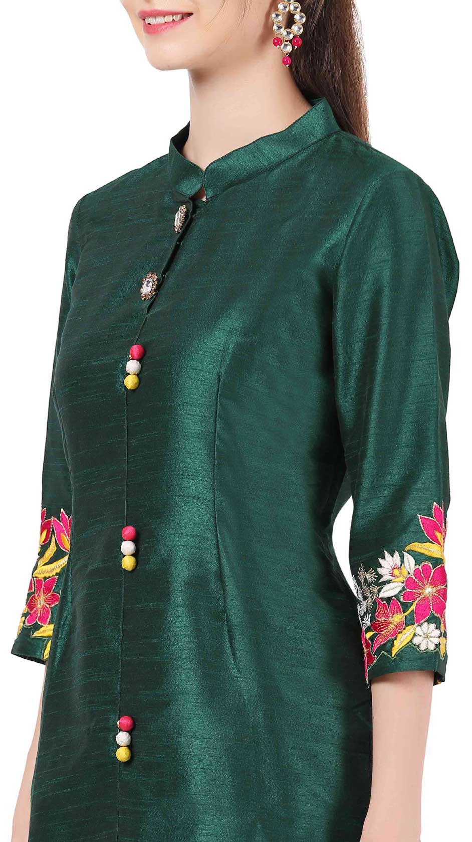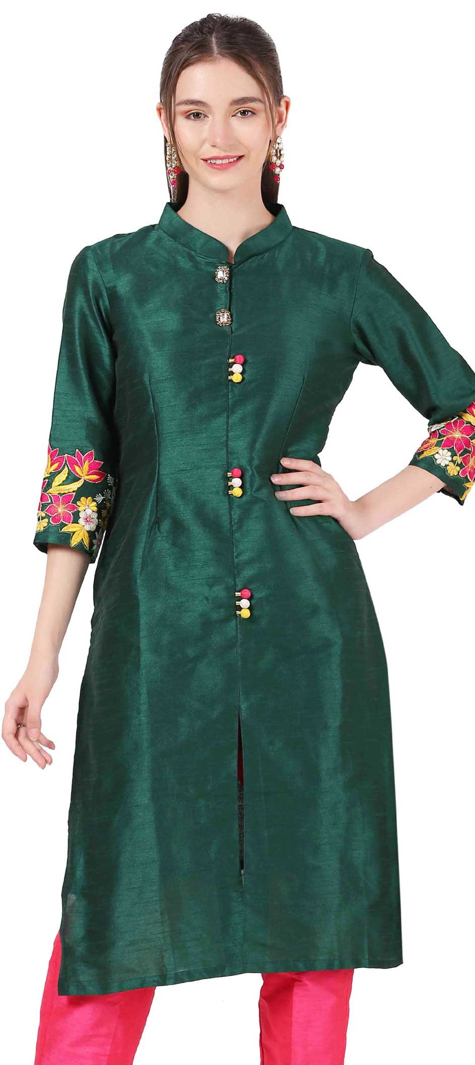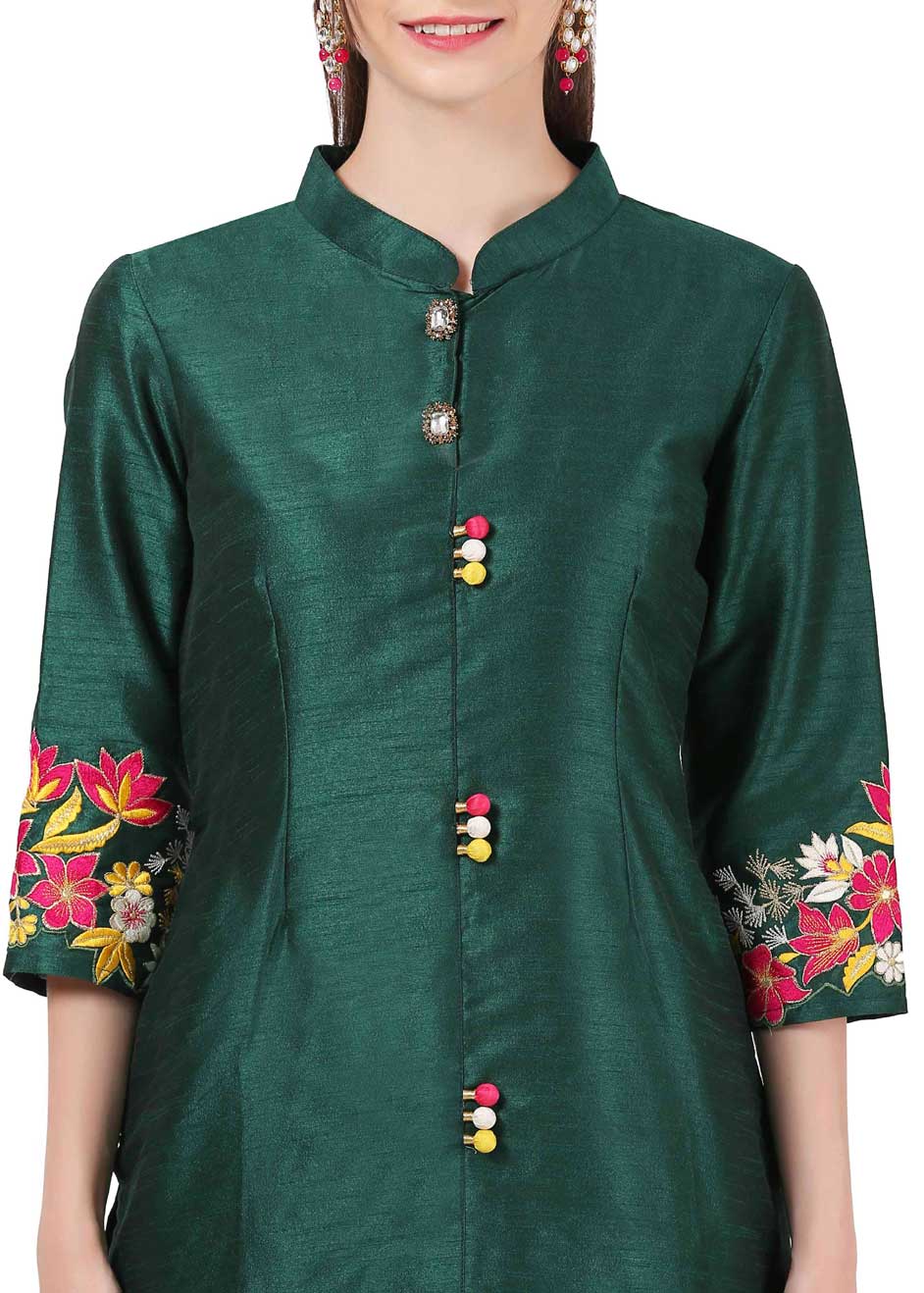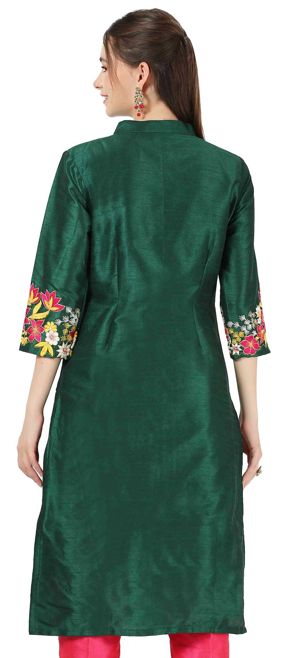 Green color Kurti in Raw Silk fabric with Resham, Thread, Zari work
