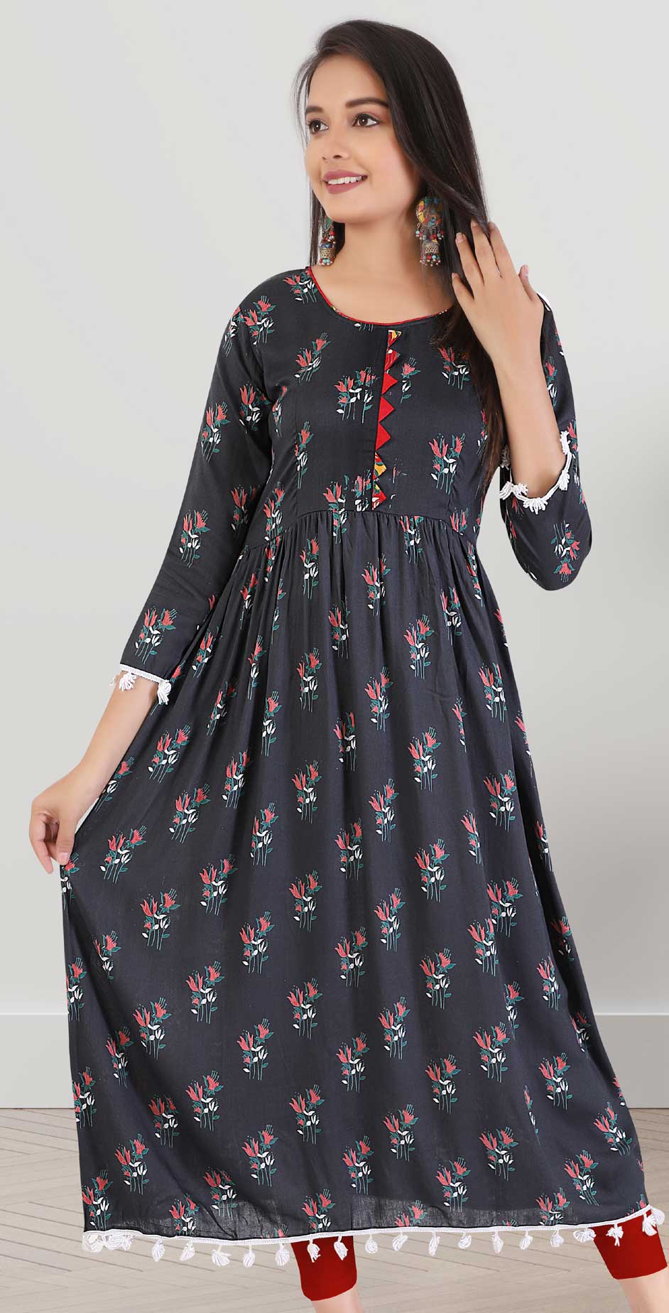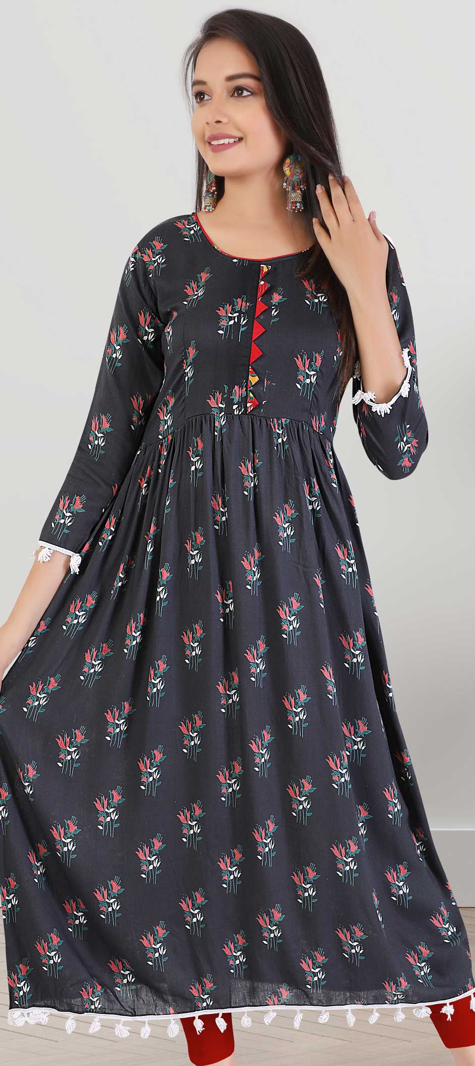 Black and Grey color Kurti in Rayon fabric with Floral, Printed work