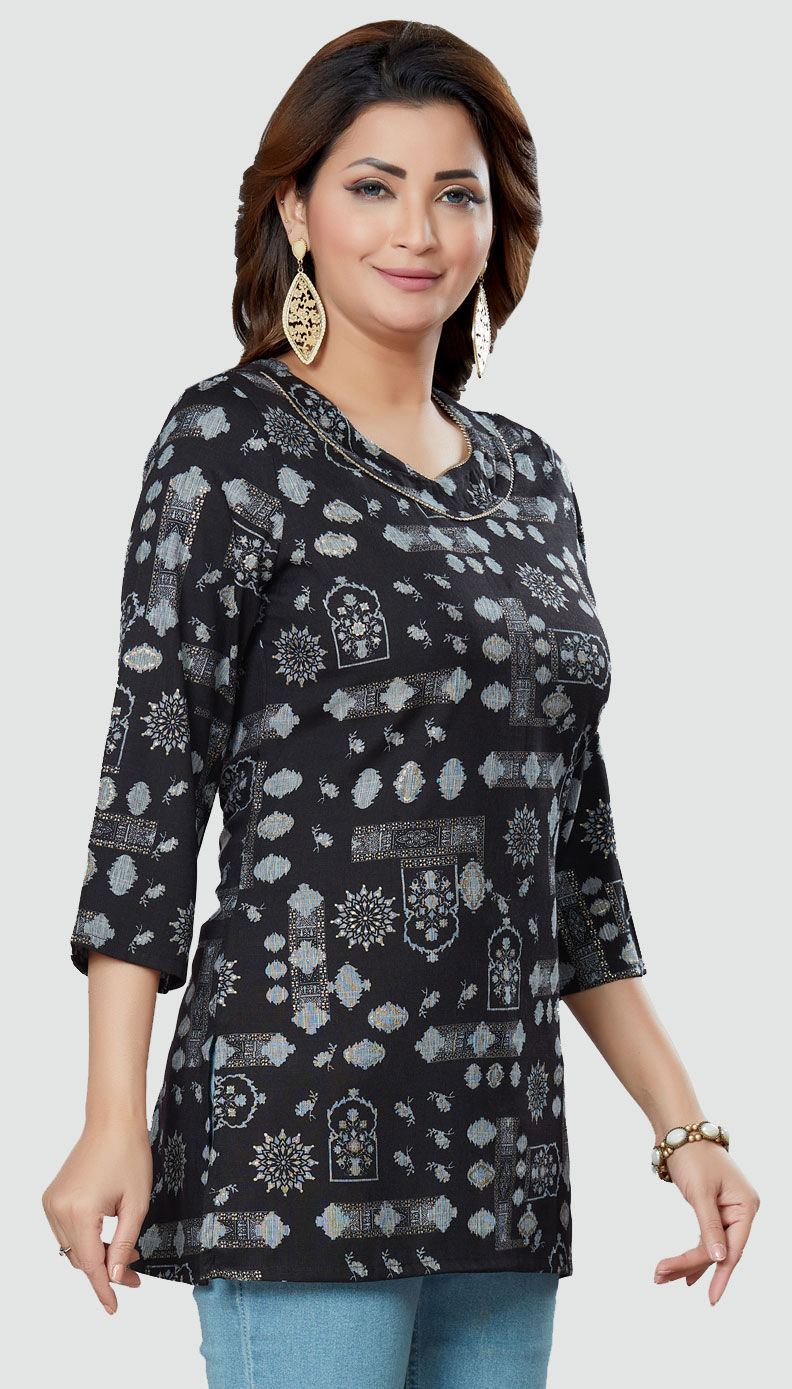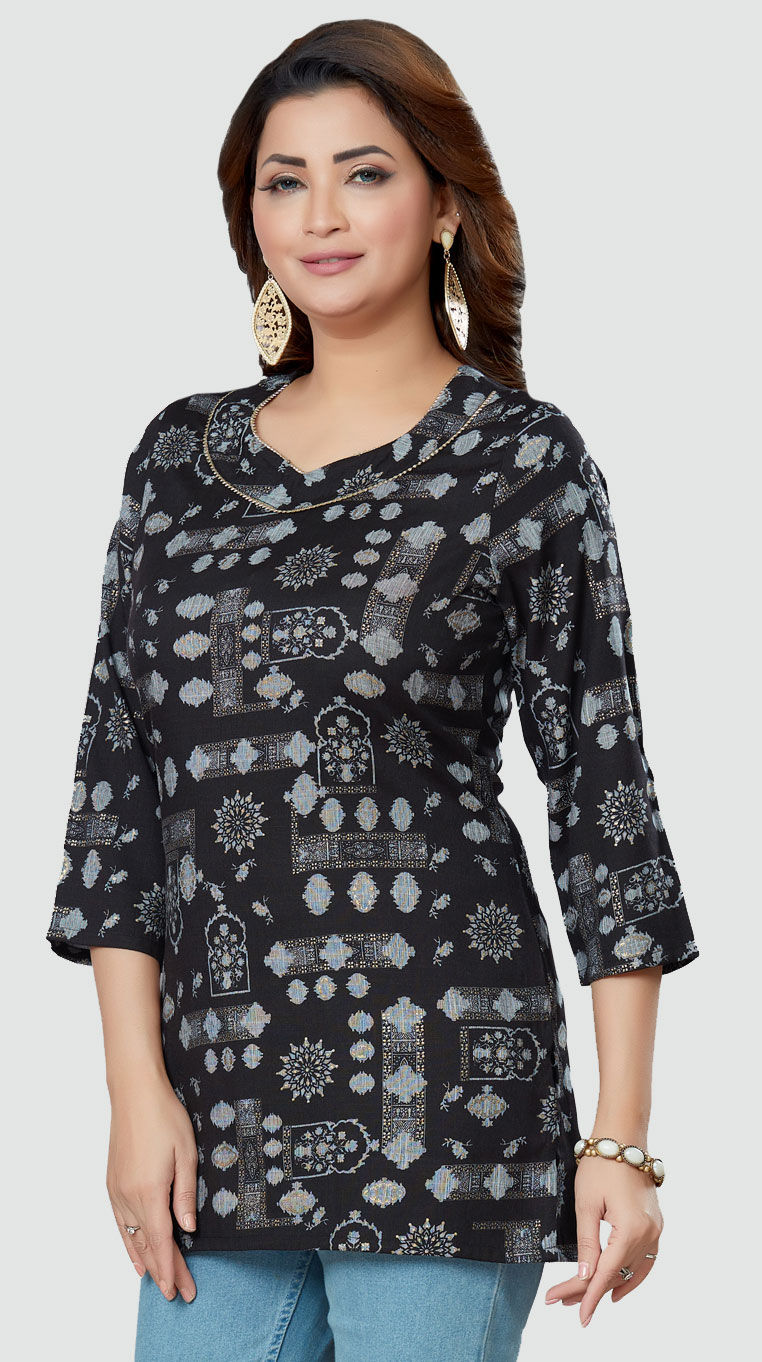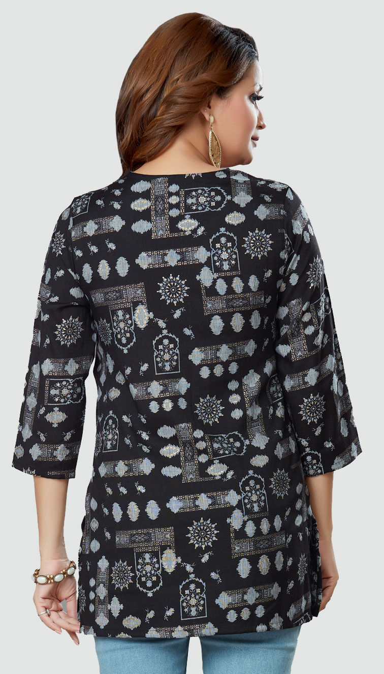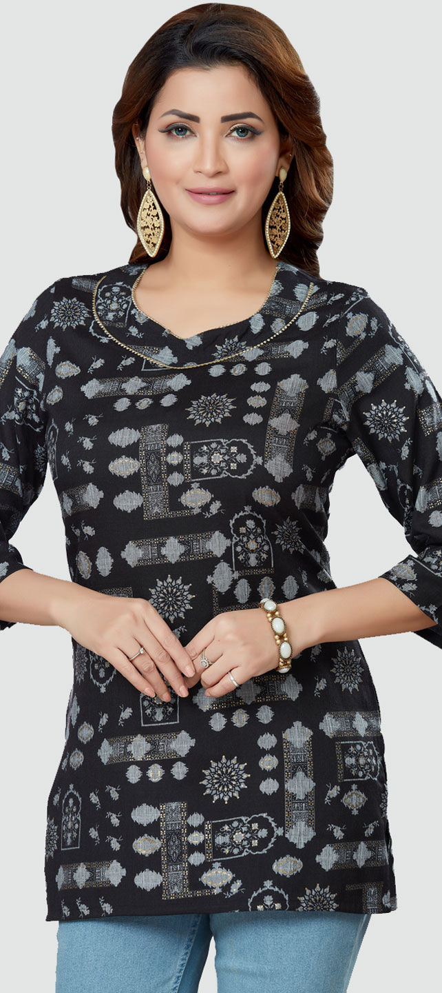 Black and Grey color Kurti in Rayon fabric with Printed work