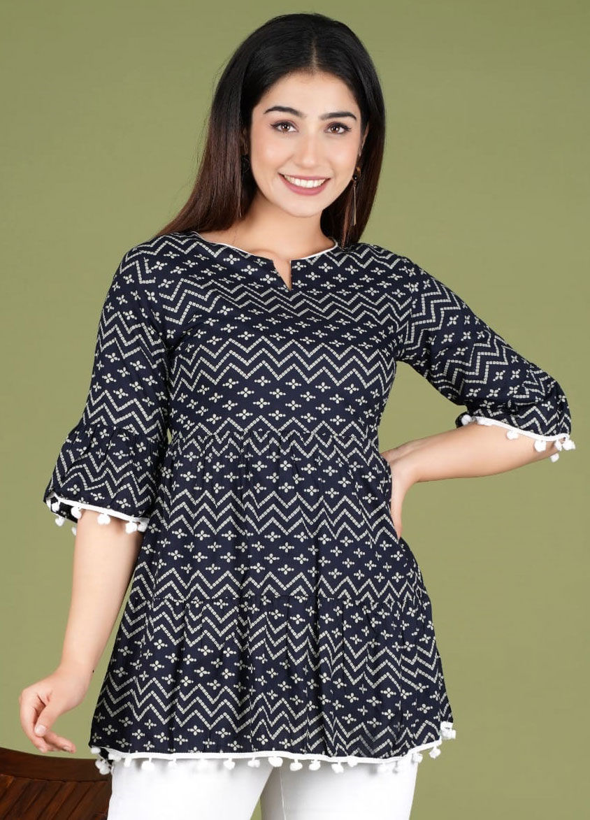 Blue color Kurti in Rayon fabric with Lace, Printed work