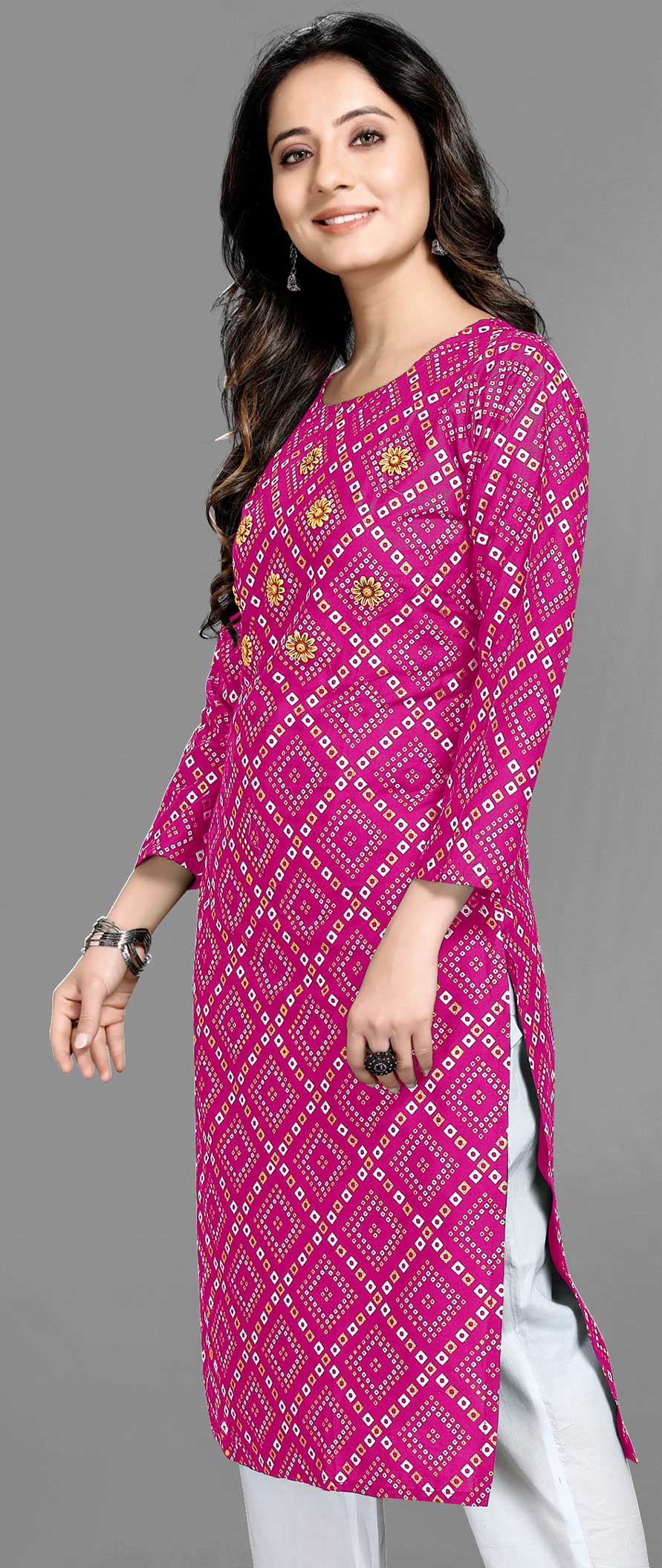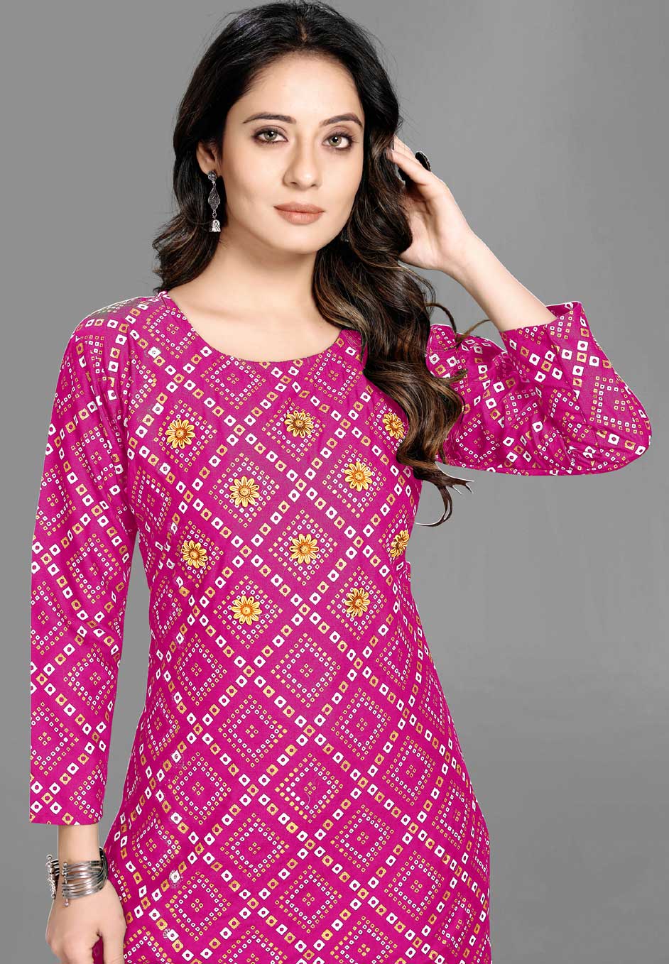 Pink and Majenta color Kurti in Rayon fabric with Bandhej, Printed work