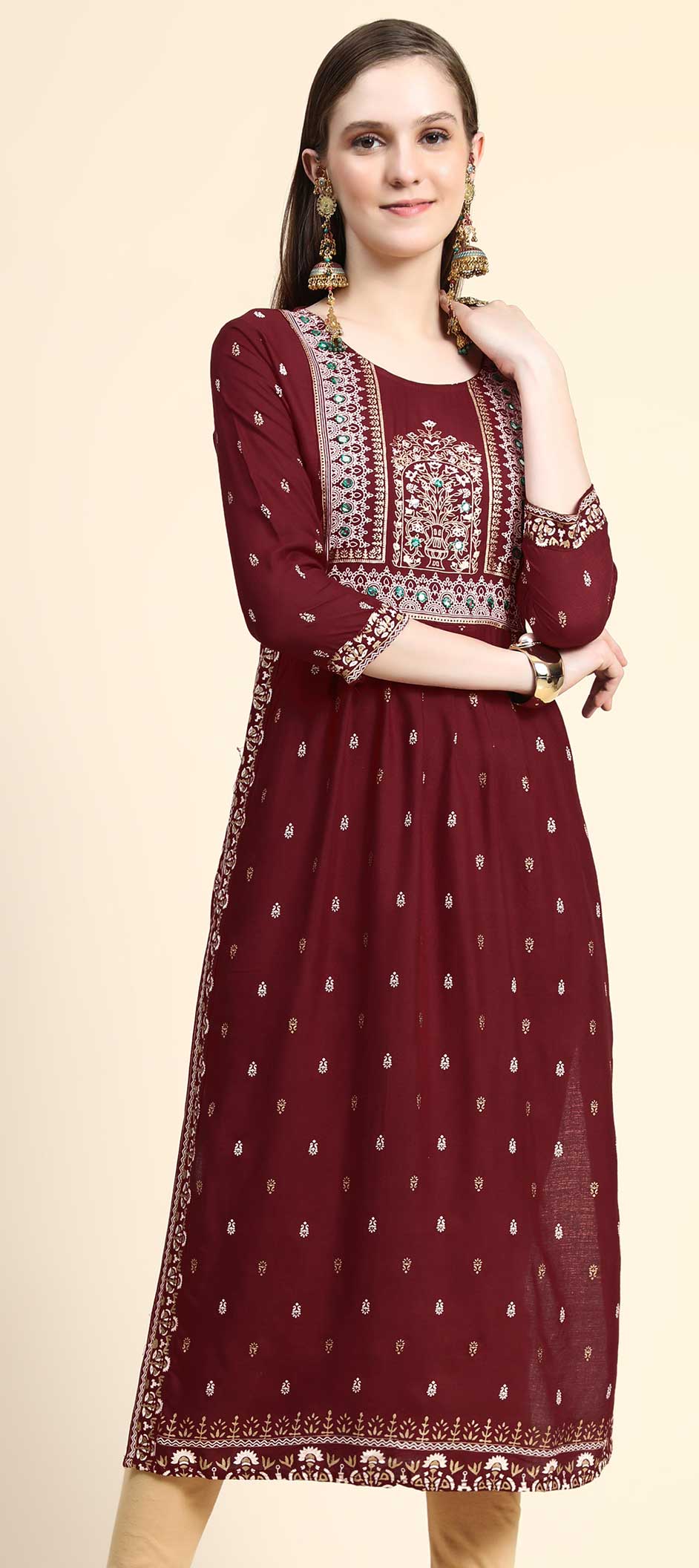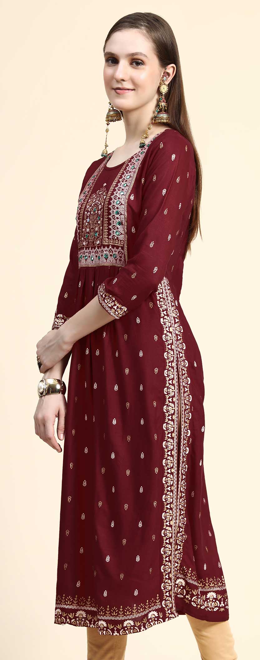Red and Maroon color Kurti in Rayon fabric with Foil Print, Mirror work