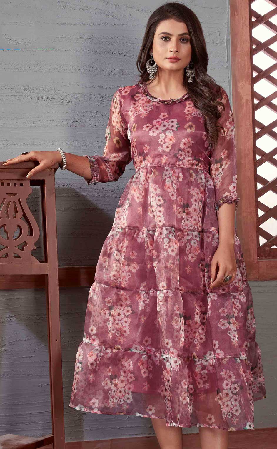 Pink and Majenta color Kurti in Organza Silk, Silk fabric with Floral, Printed work