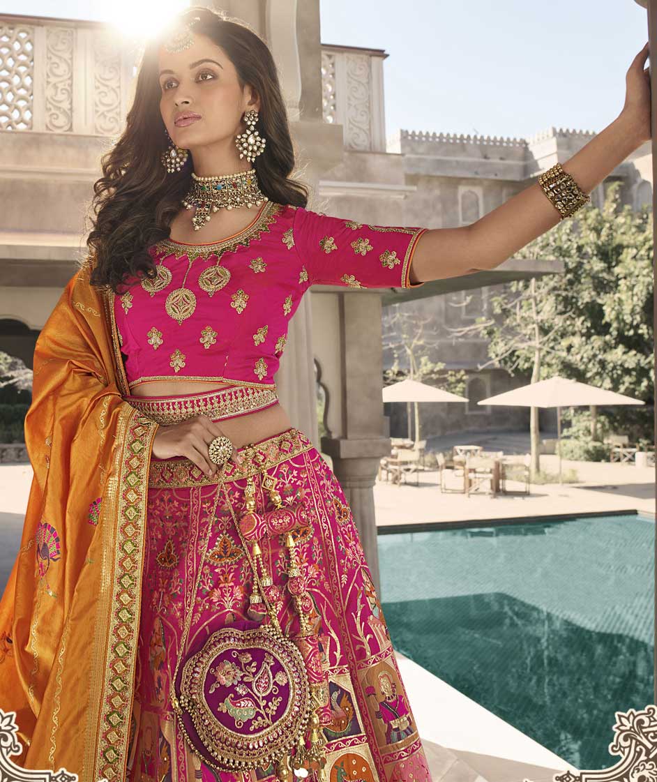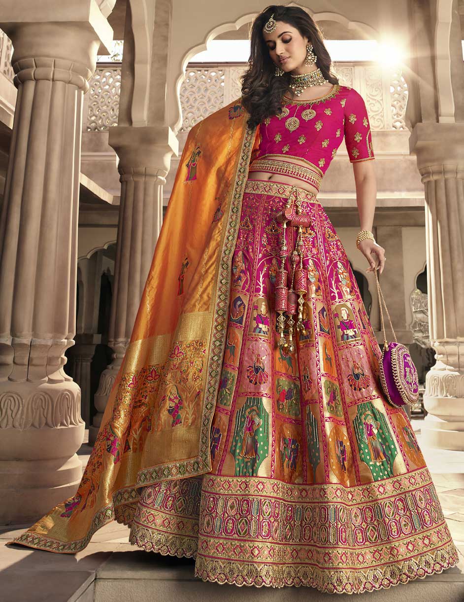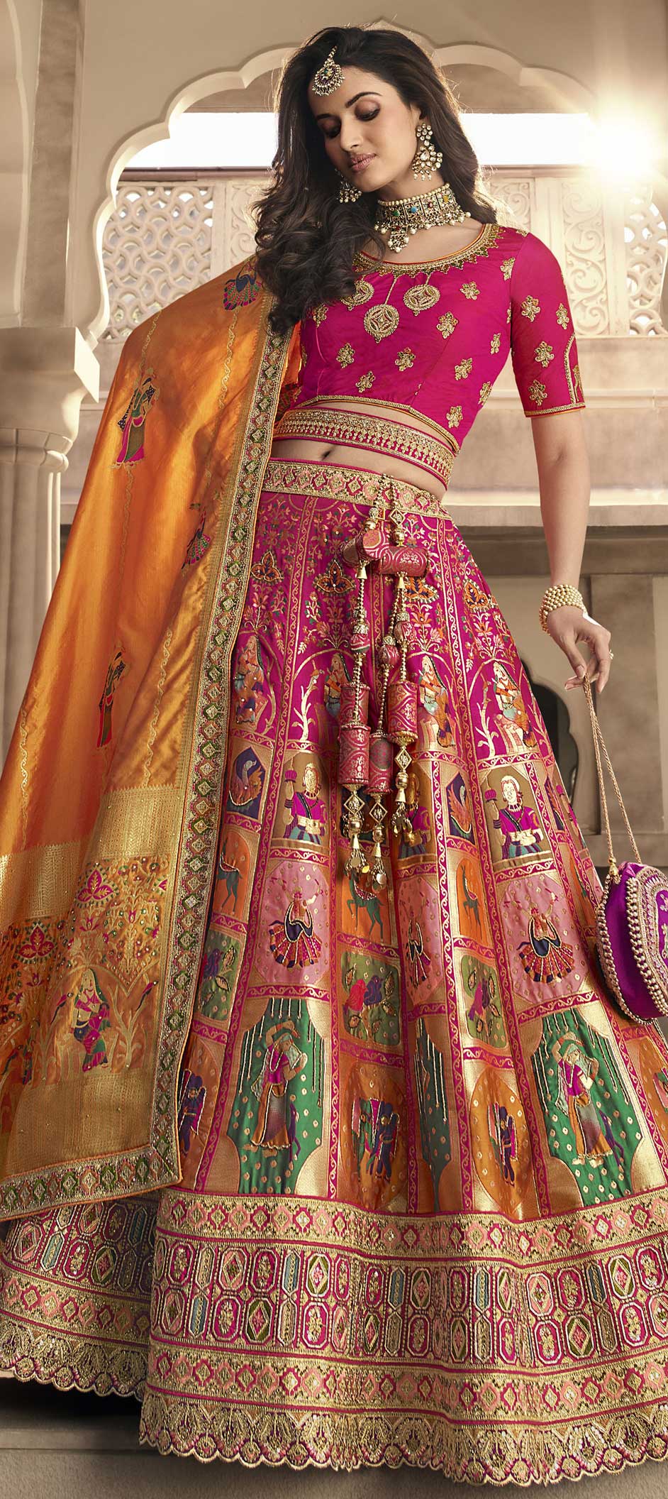 Orange, Pink and Majenta color Lehenga in Banarasi Silk fabric with Embroidered, Lace, Resham, Stone, Zari work