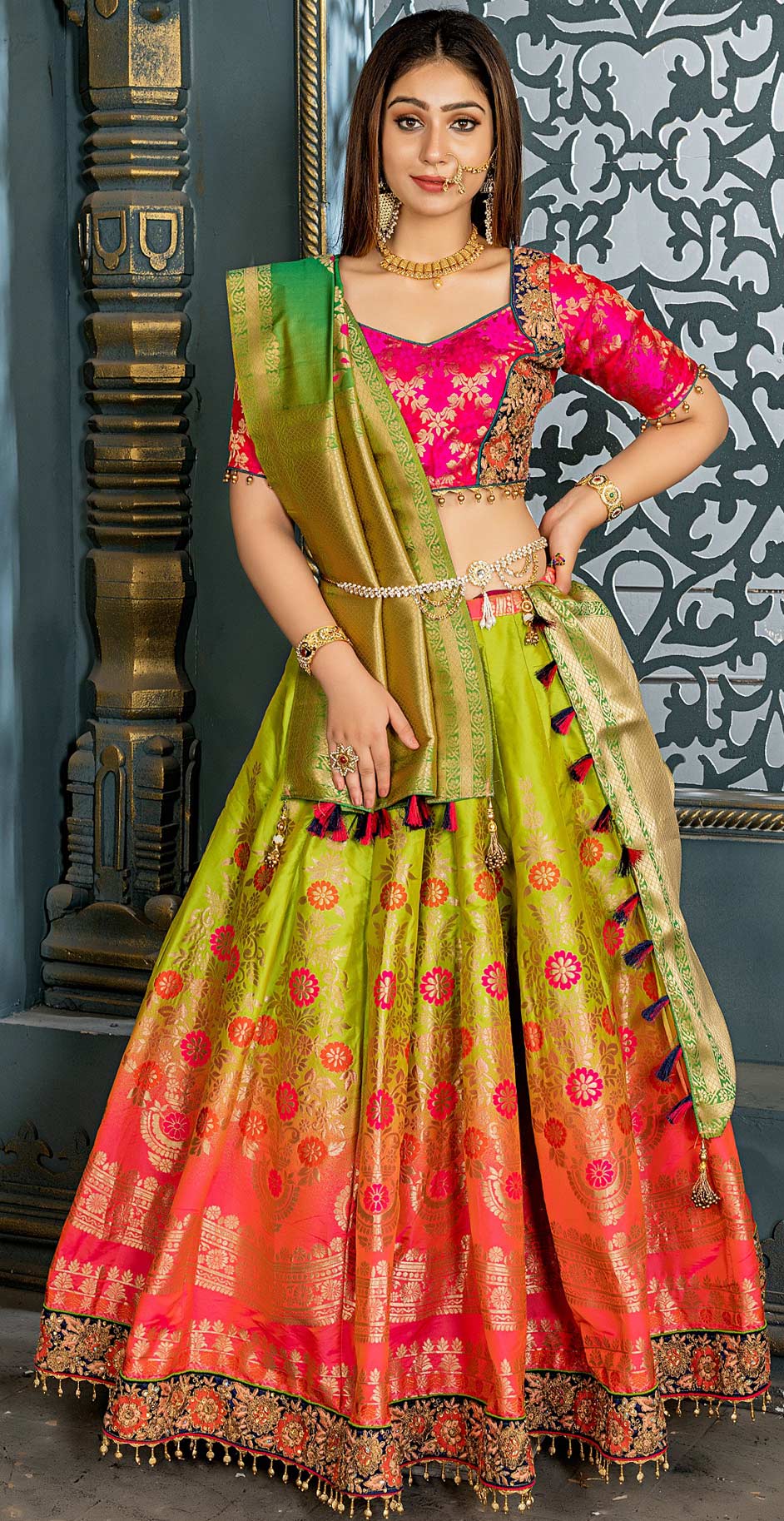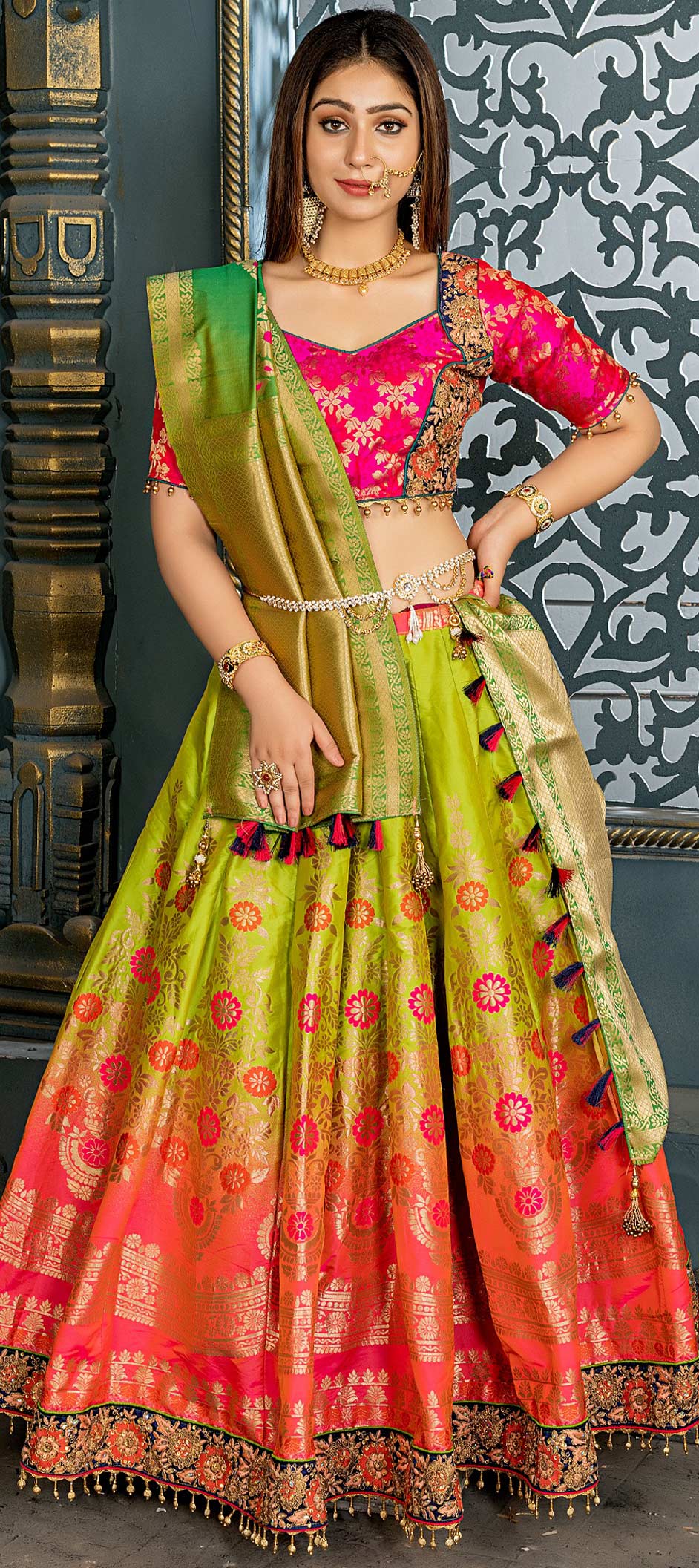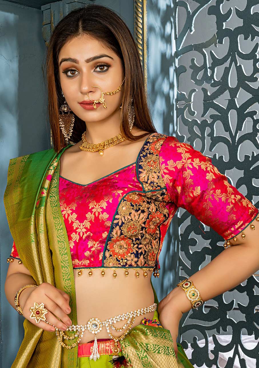 Description: Green, Pink and Majenta color Lehenga in Banarasi Silk, Silk fabric with Embroidered, Lace, Resham, Stone, Thread, Zari work