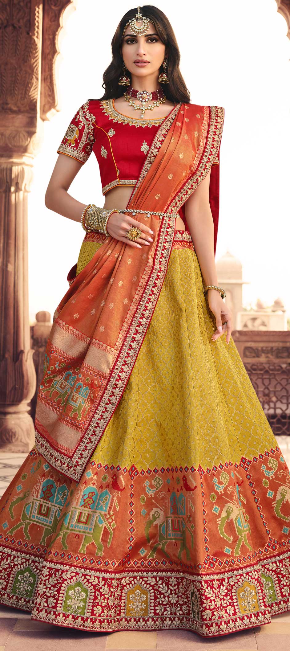 Beige and Brown, Yellow color Lehenga in Banarasi Silk fabric with Embroidered, Resham, Zari work