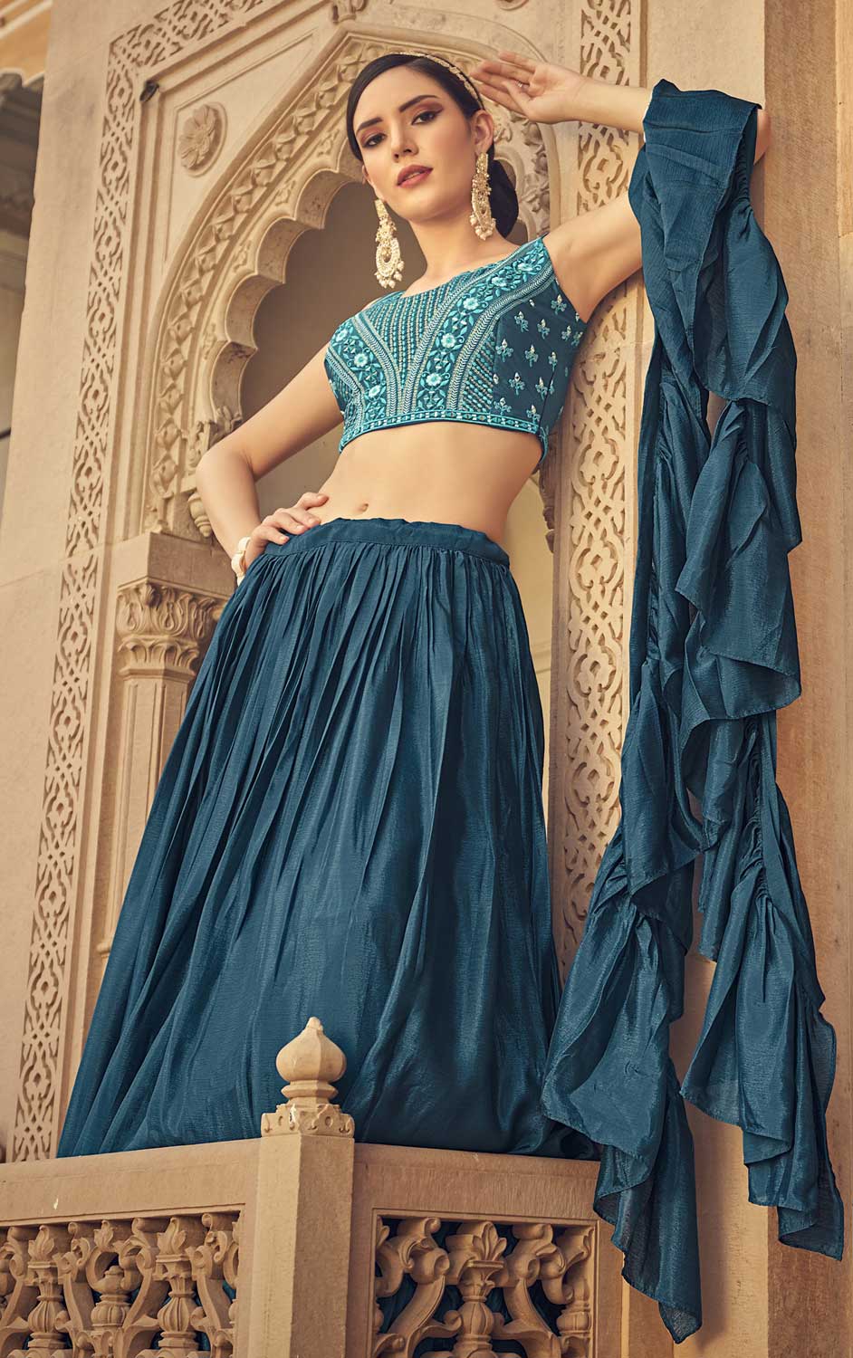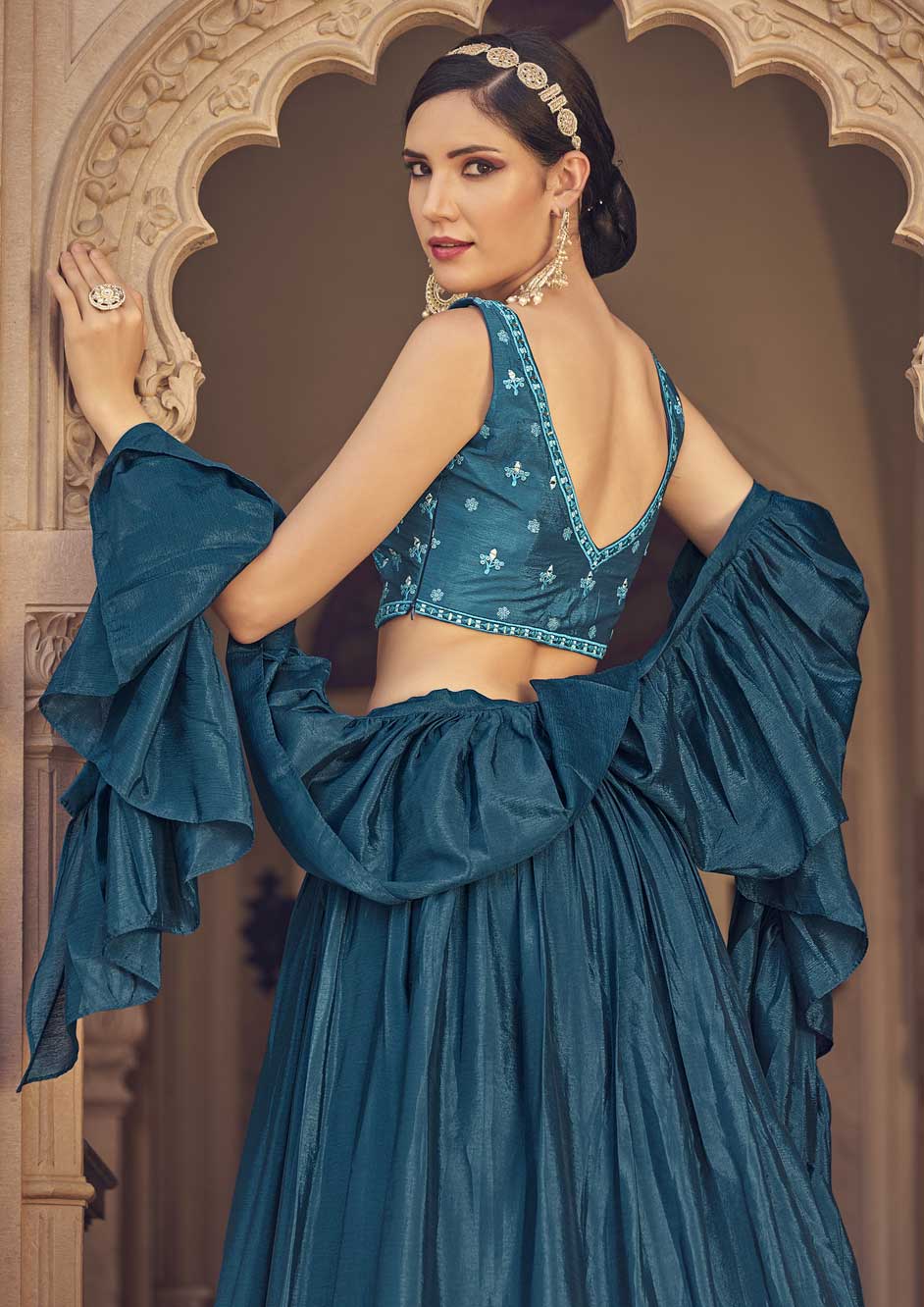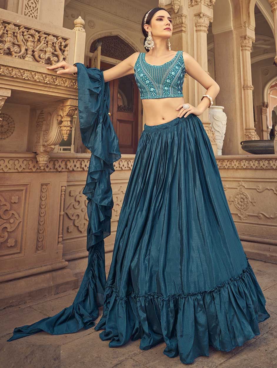 Blue color Lehenga in Chiffon fabric with Mirror, Thread work