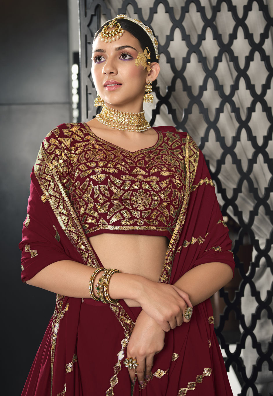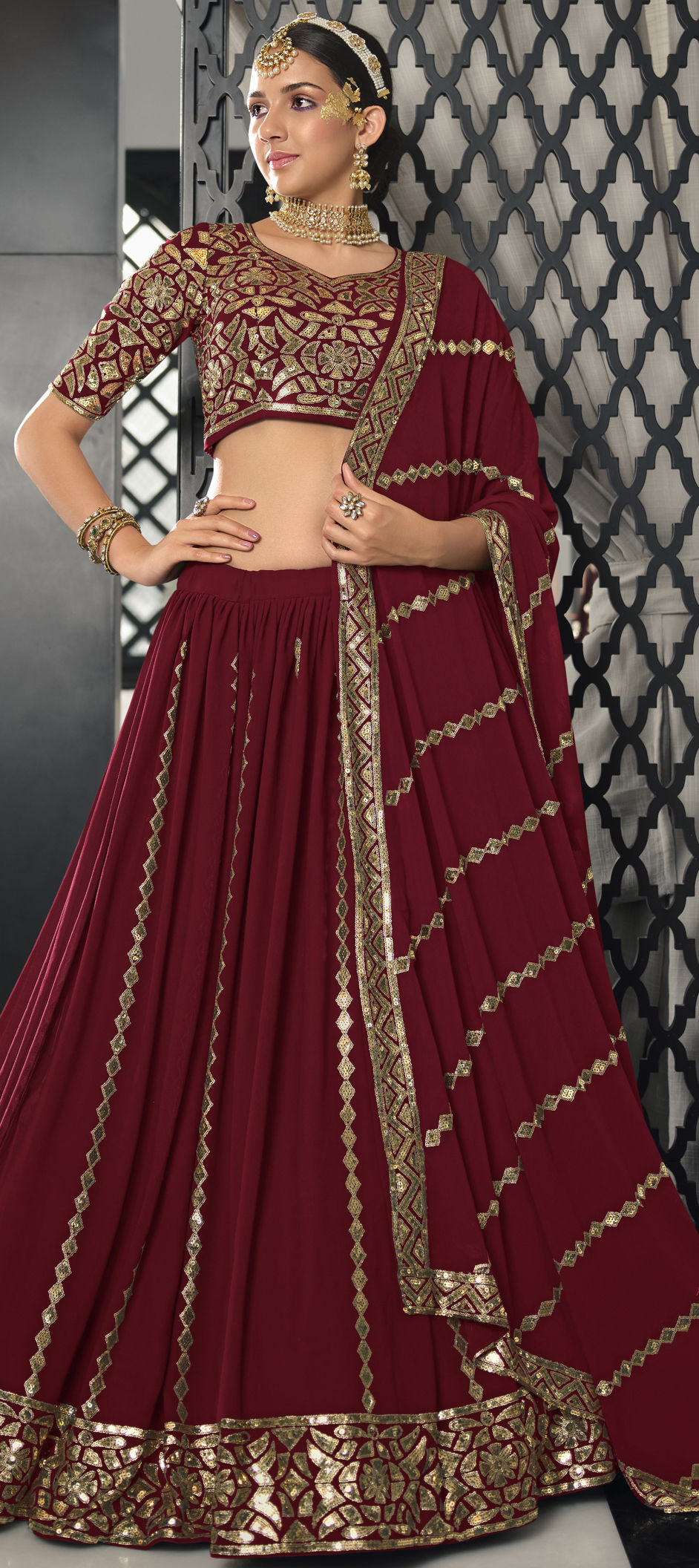 Red and Maroon color Lehenga in Georgette fabric with Embroidered, Sequence, Thread work