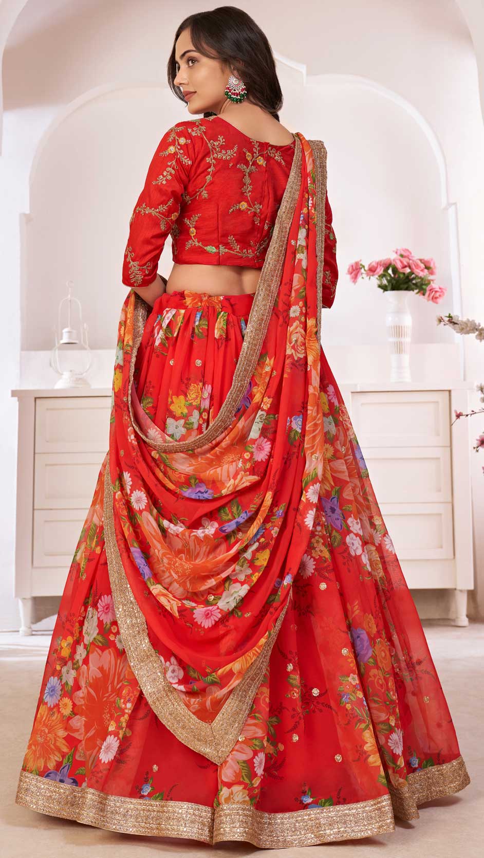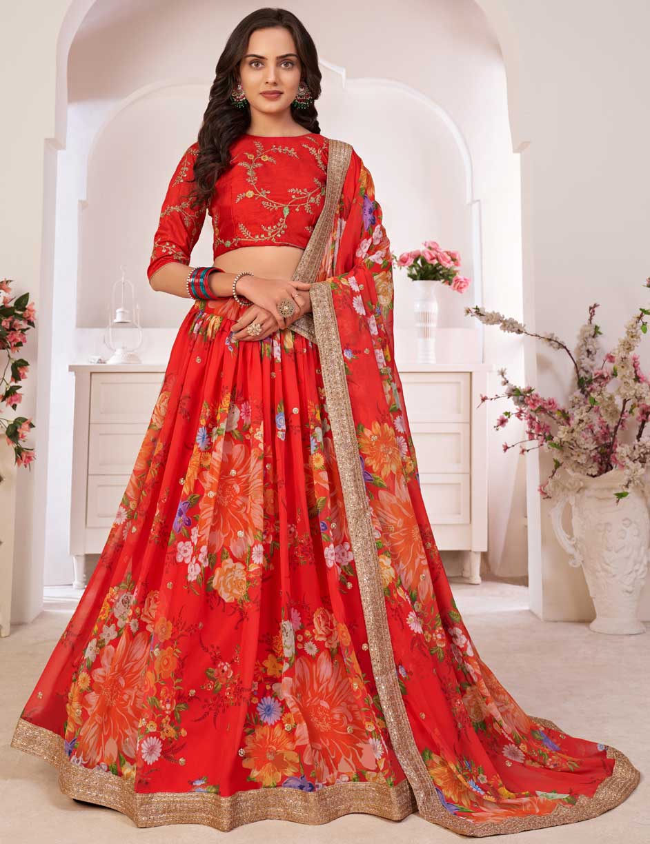 Red and Maroon color Lehenga in Georgette fabric with Digital Print, Embroidered, Floral, Sequence work