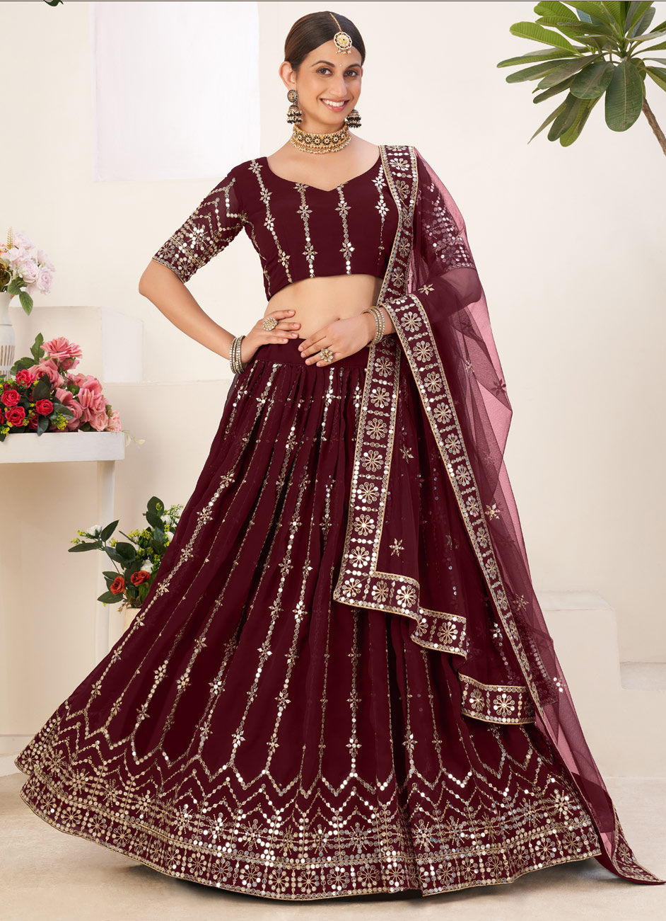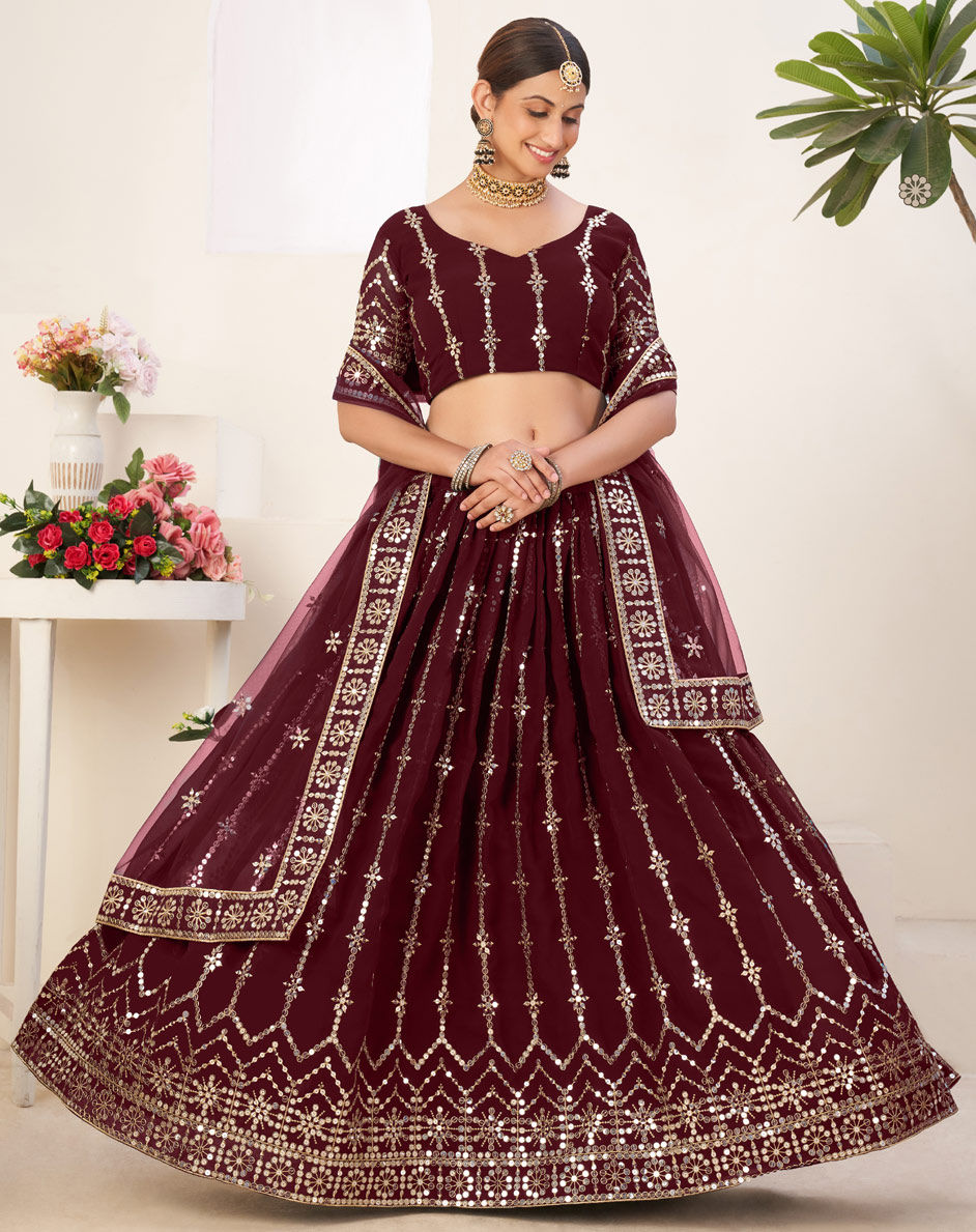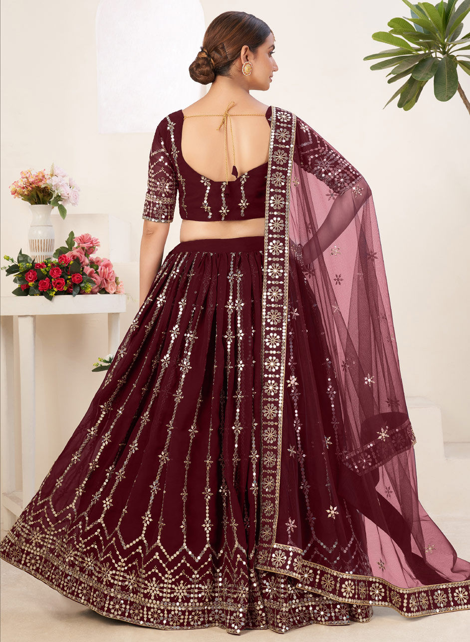 Red and Maroon color Lehenga in Georgette fabric with Sequence, Thread work