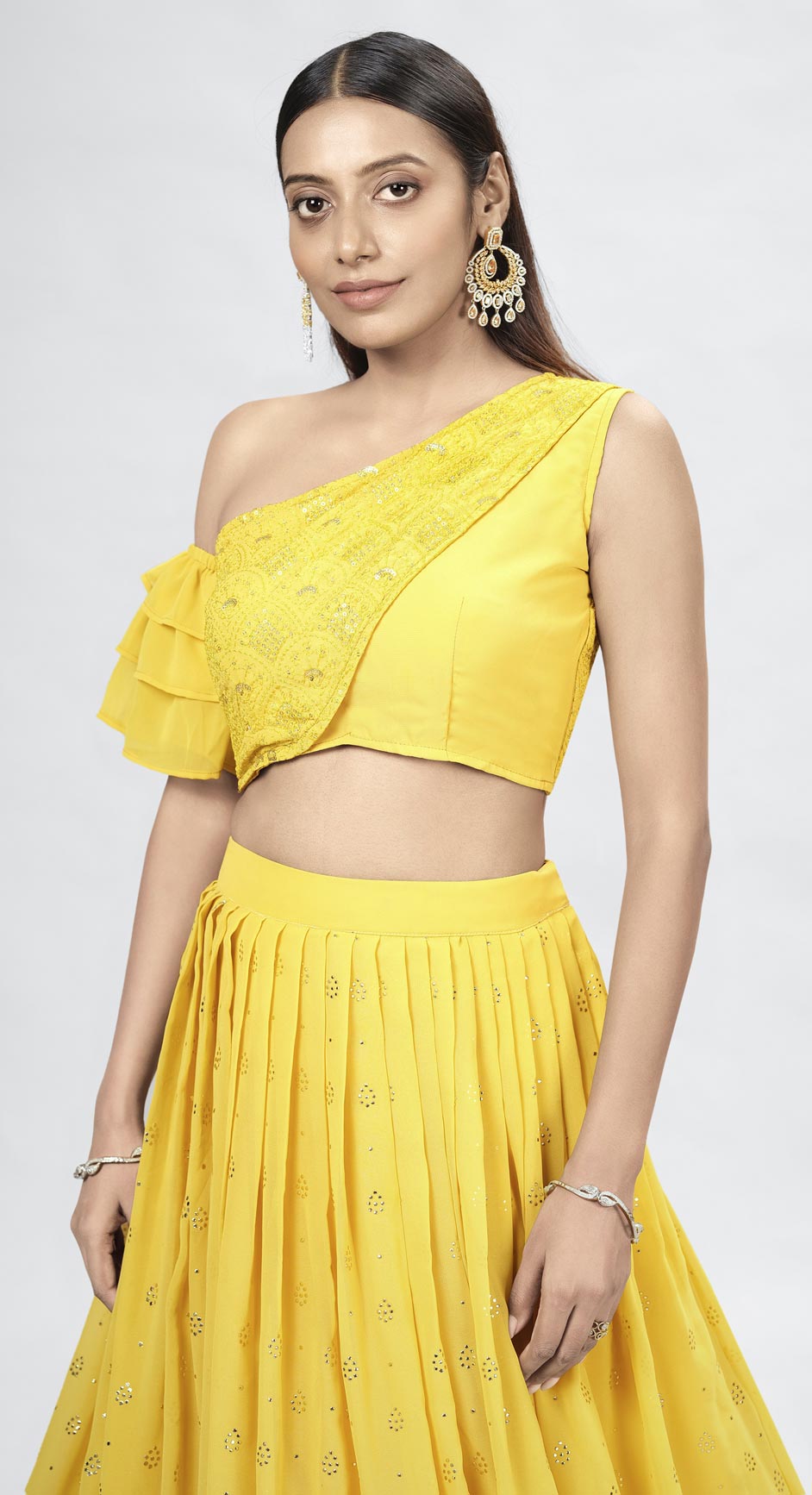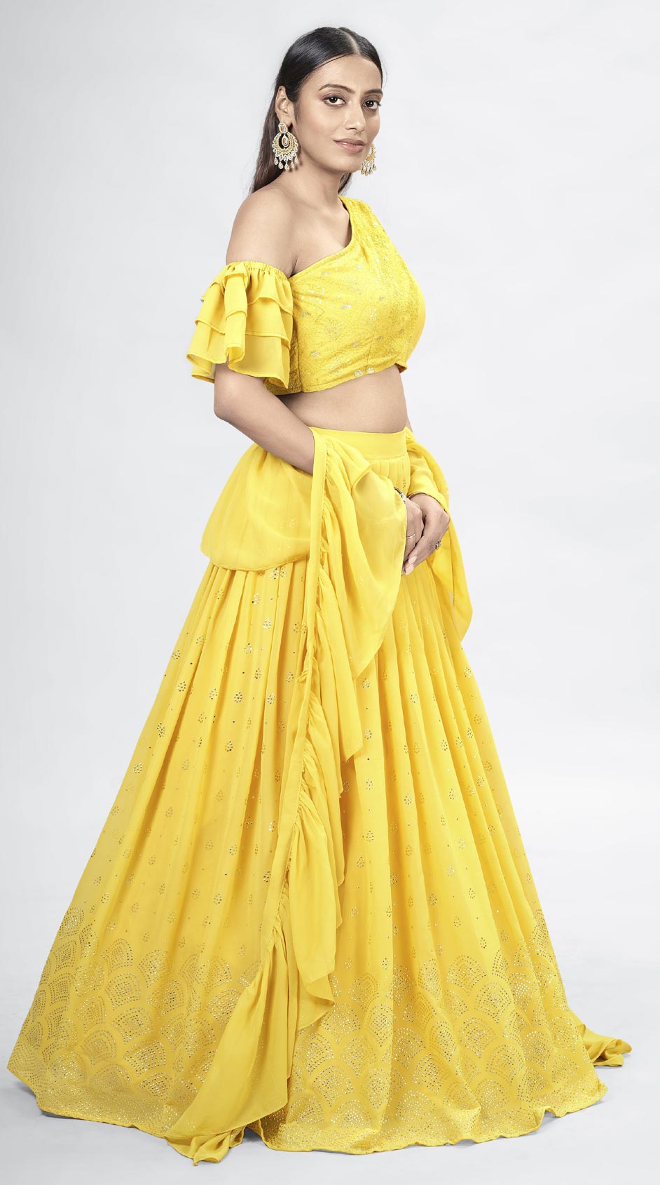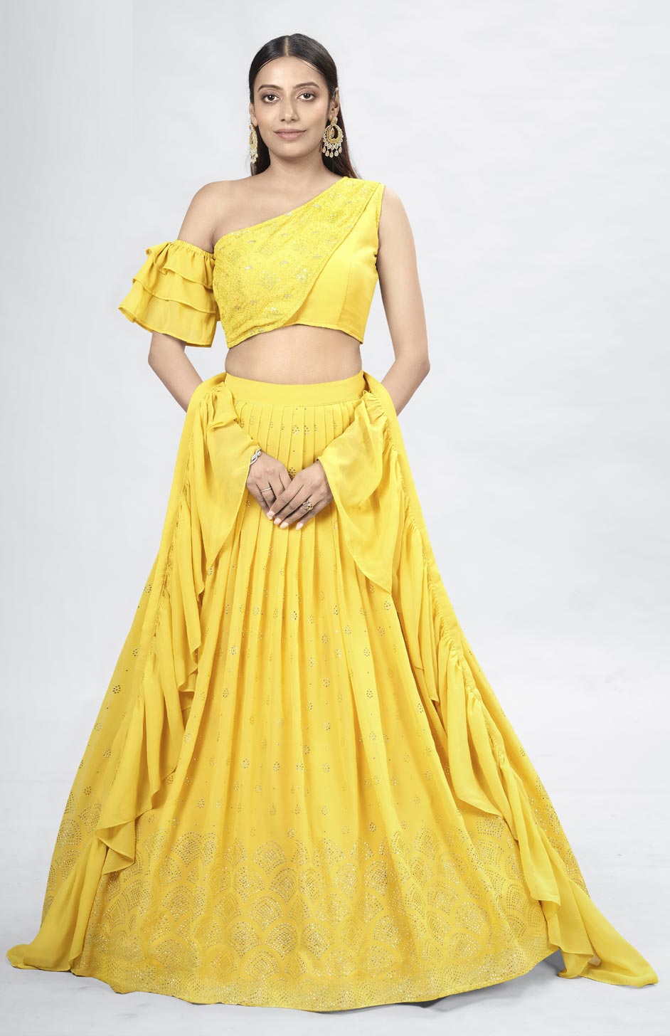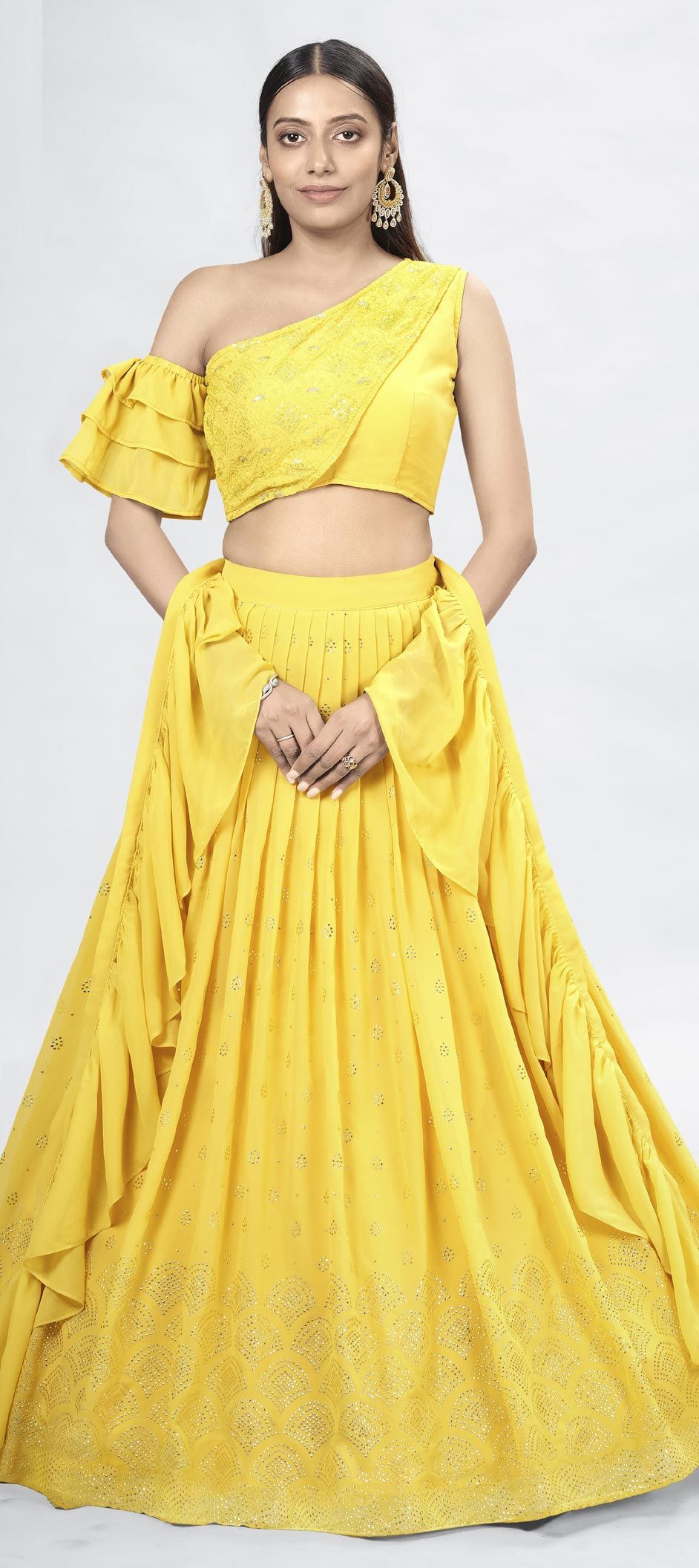 Yellow color Lehenga in Georgette fabric with Sequence, Thread work