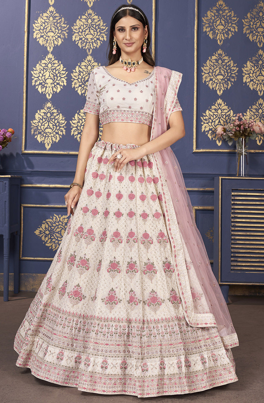 White and Off White color Lehenga in Georgette fabric with Embroidered, Resham, Sequence, Thread work