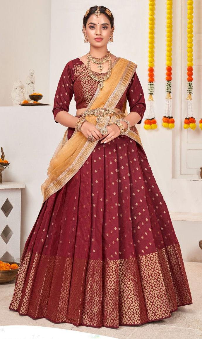 Red and Maroon color Lehenga in Jacquard fabric with Weaving work