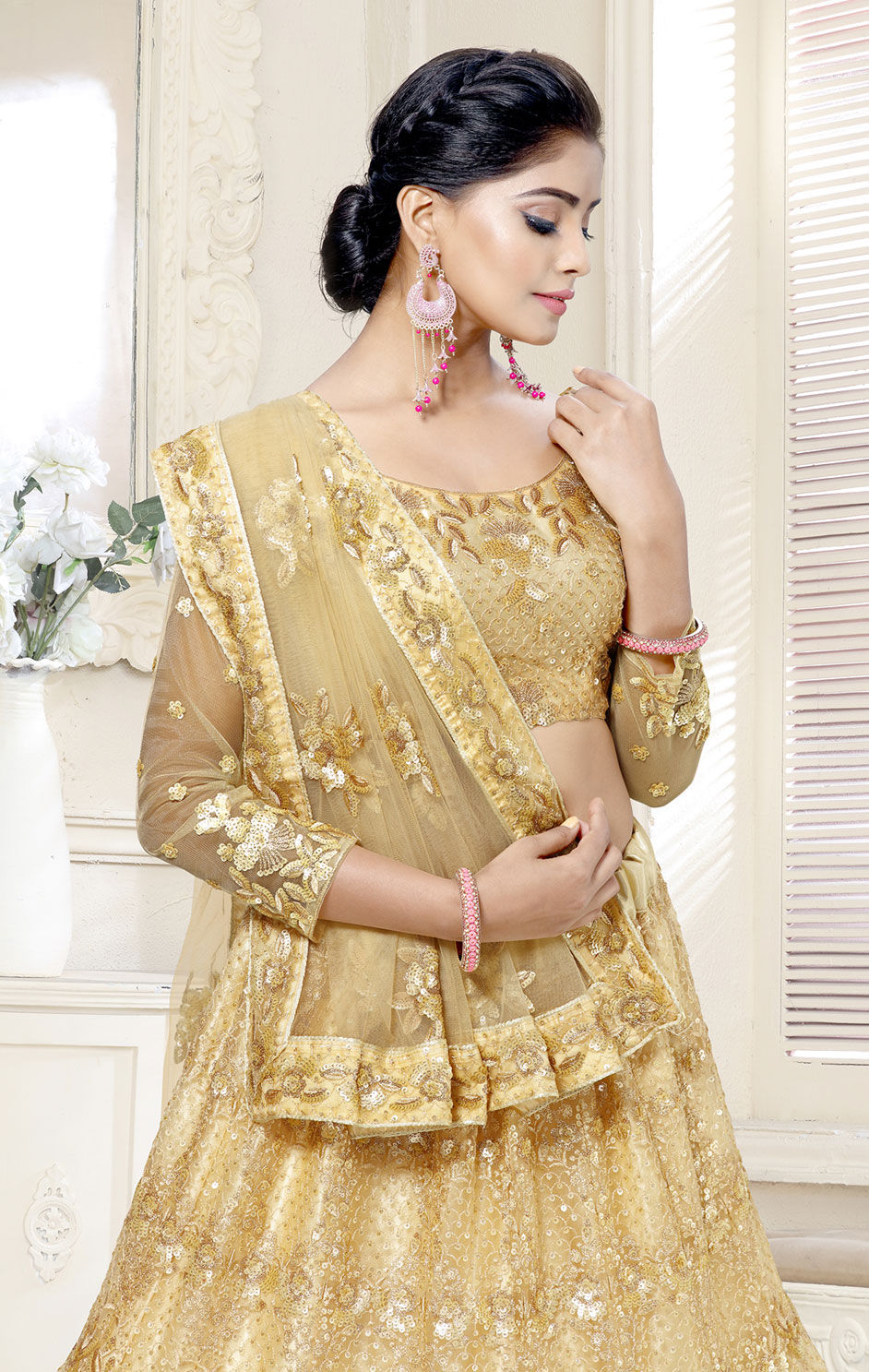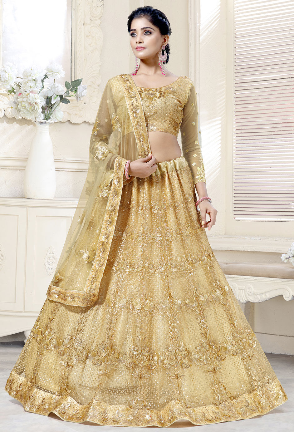 Gold color Lehenga in Net fabric with Embroidered, Sequence, Thread work