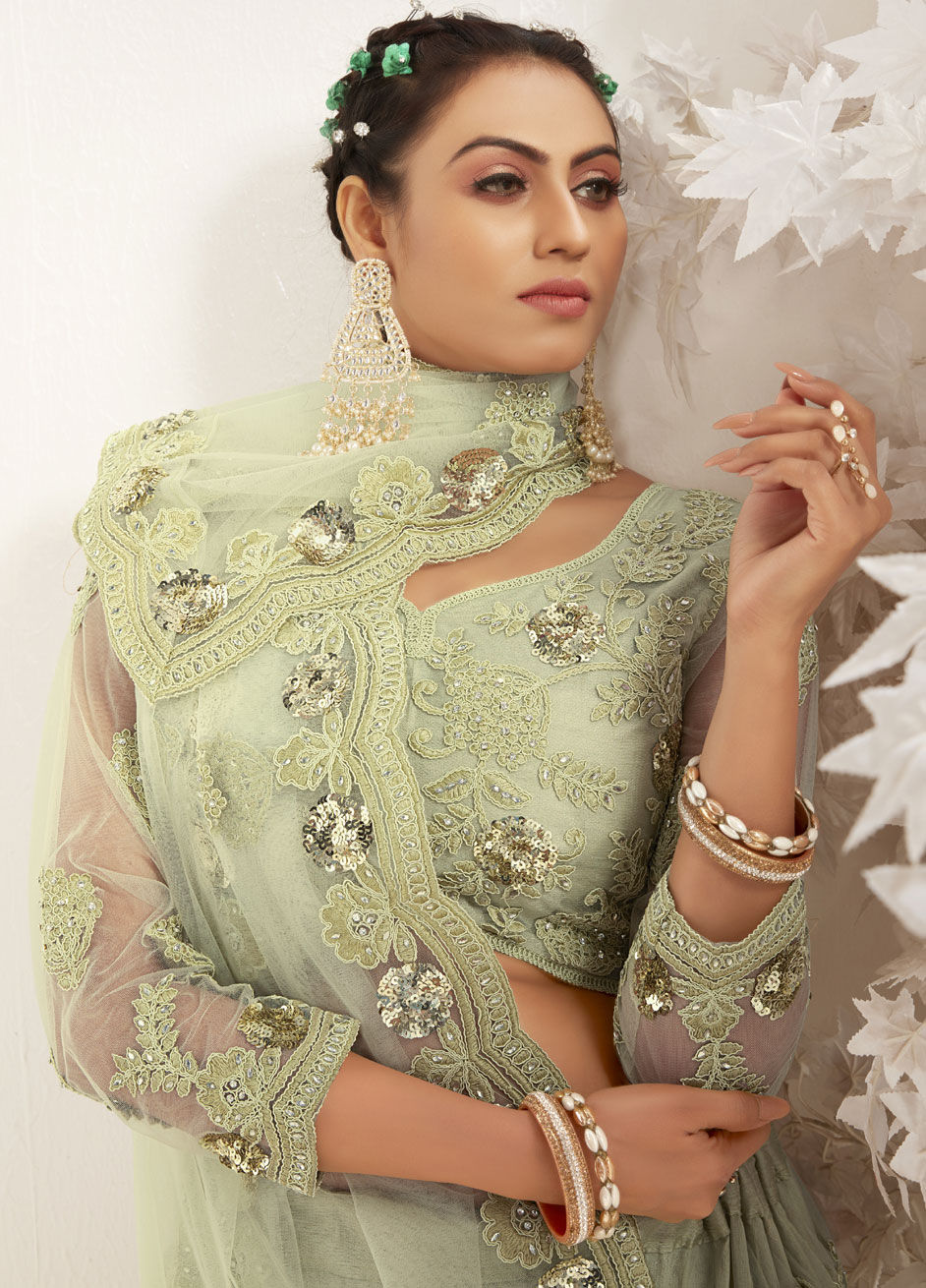 Green color Lehenga in Net fabric with Embroidered, Resham, Sequence, Thread work