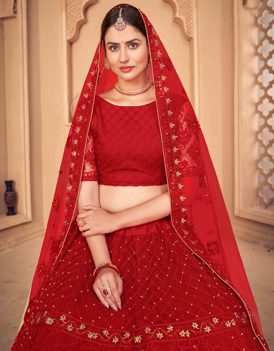 Red and Maroon color Lehenga in Net fabric with Embroidered, Kundan work