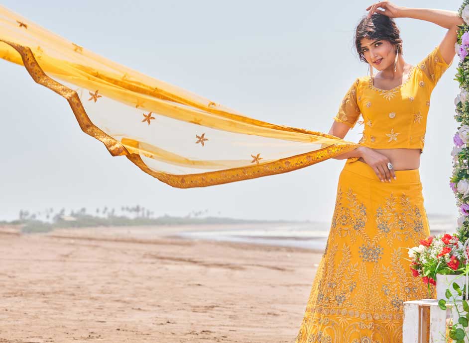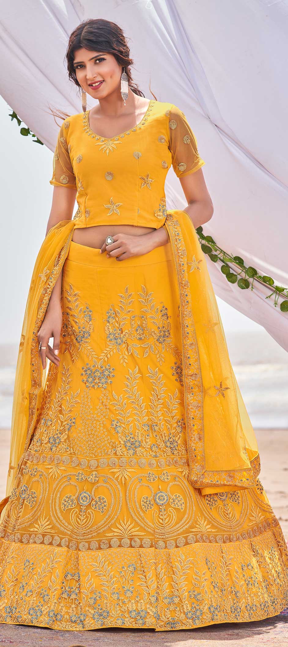Yellow color Lehenga in Net fabric with Sequence, Thread work