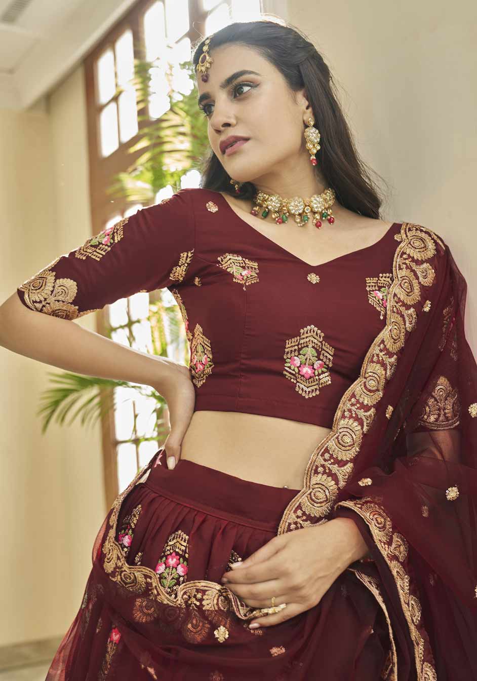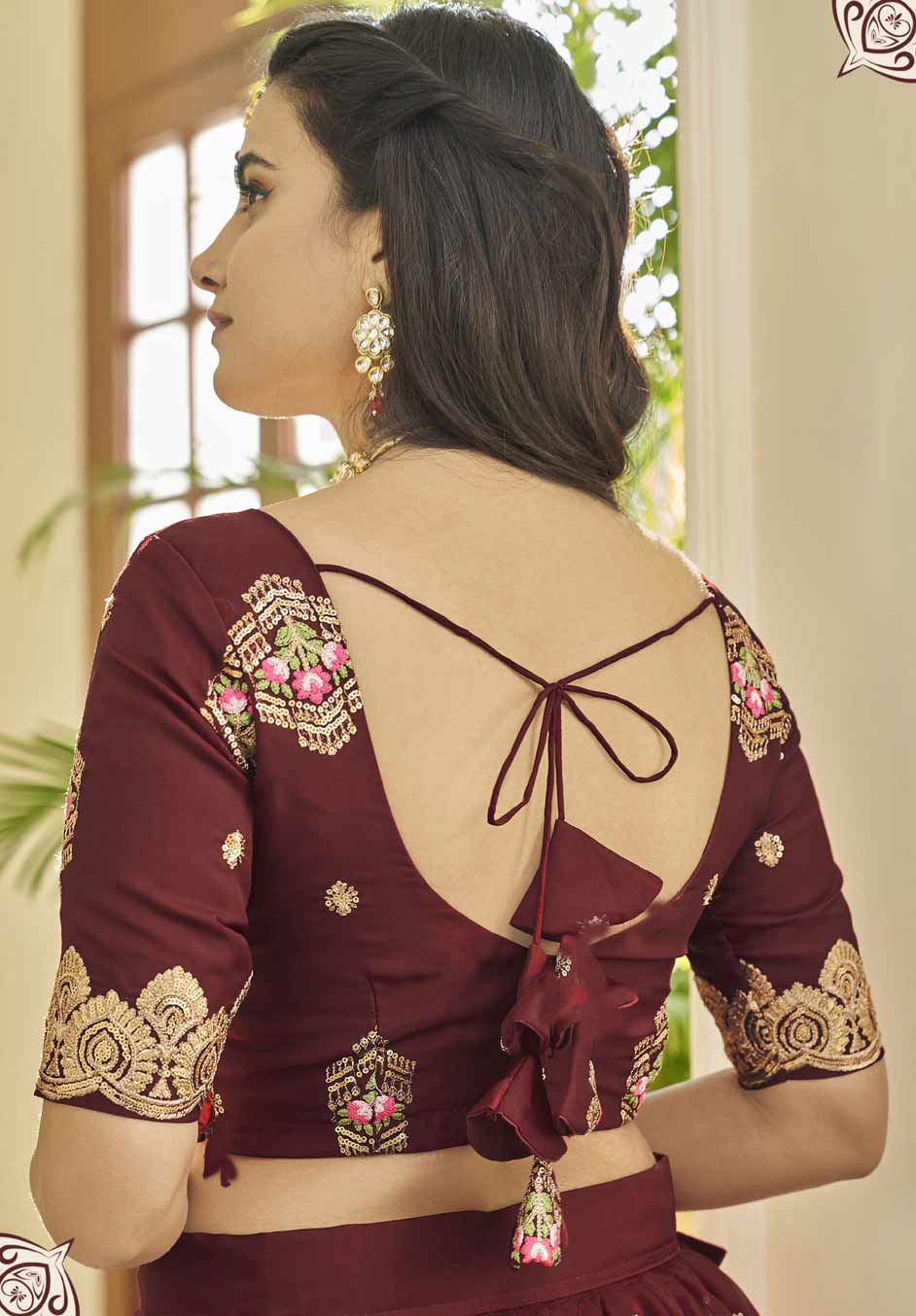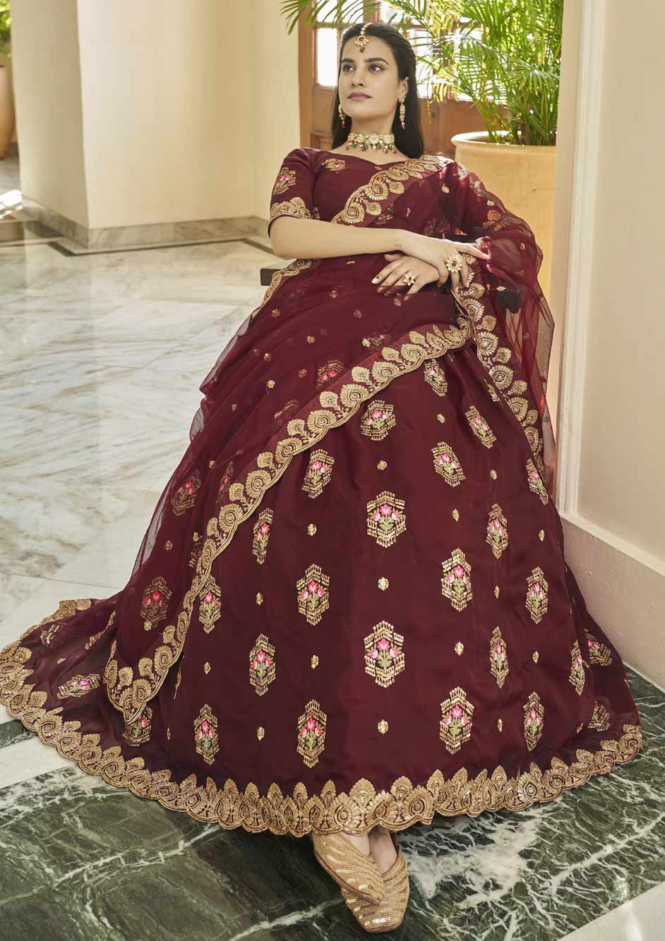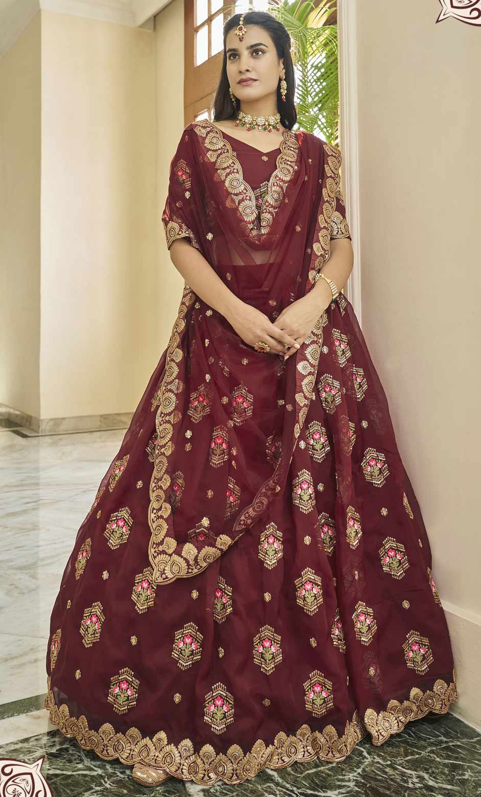 Red and Maroon color Lehenga in Organza Silk fabric with Embroidered, Sequence, Thread, Zari work