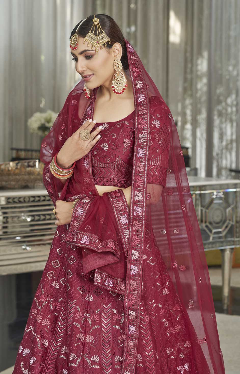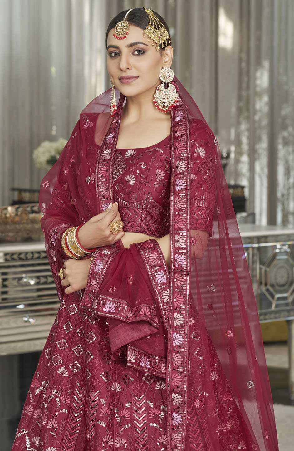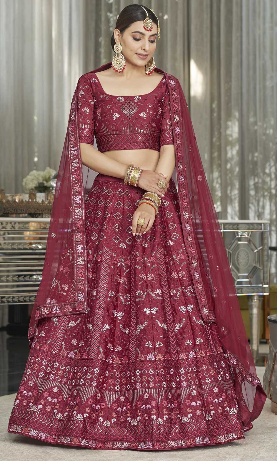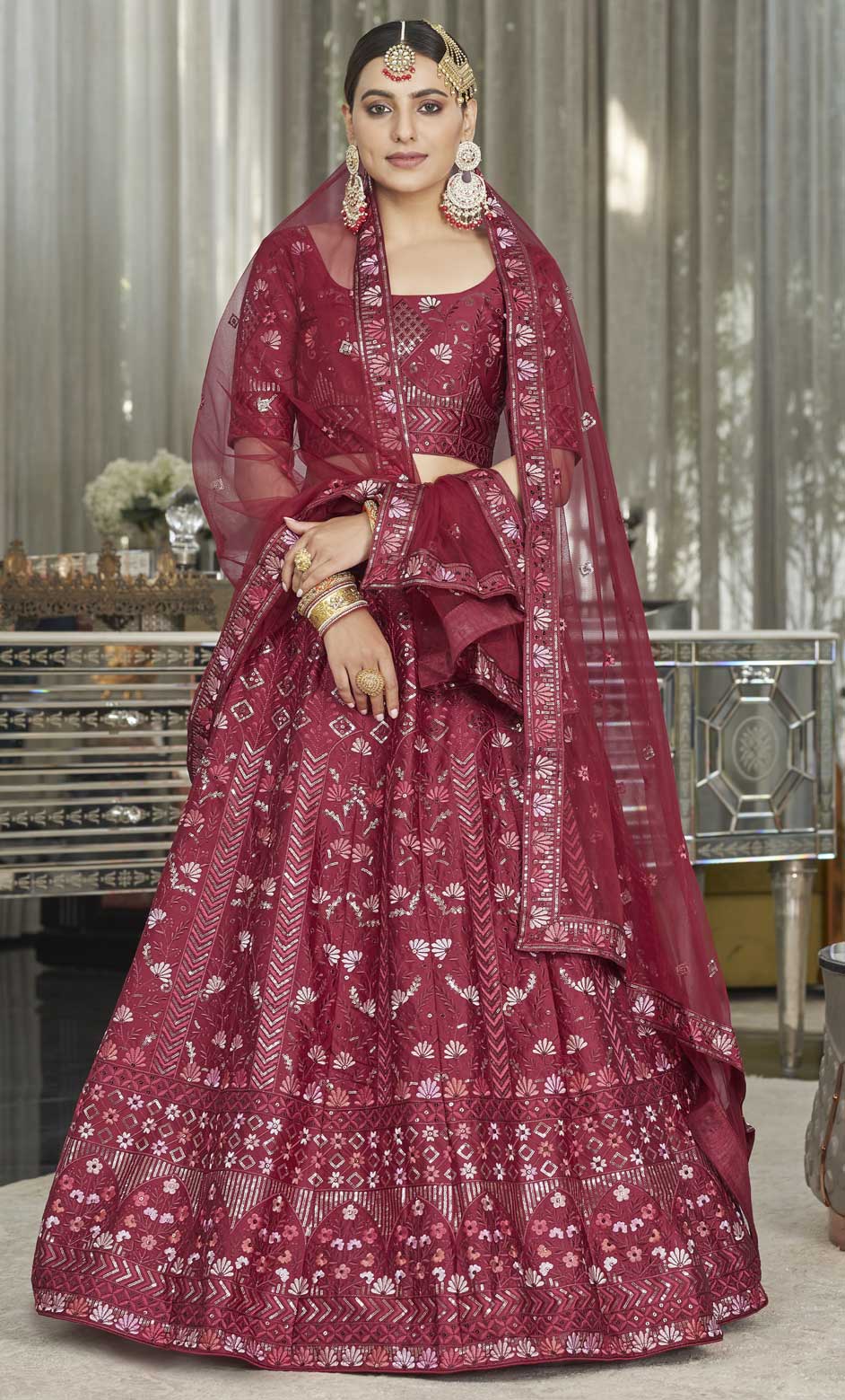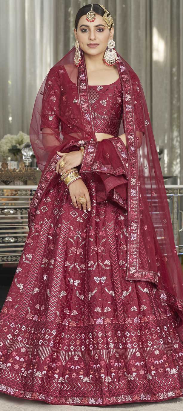 Red and Maroon color Lehenga in Silk fabric with Embroidered, Sequence, Thread work