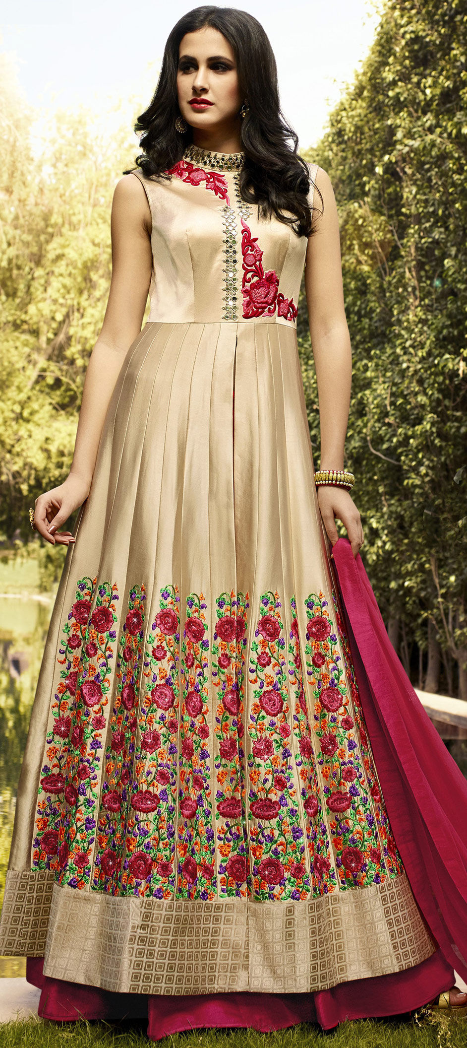 Beige and Brown color Long Lehenga Choli in Taffeta Silk fabric with Embroidered, Stone, Zari work