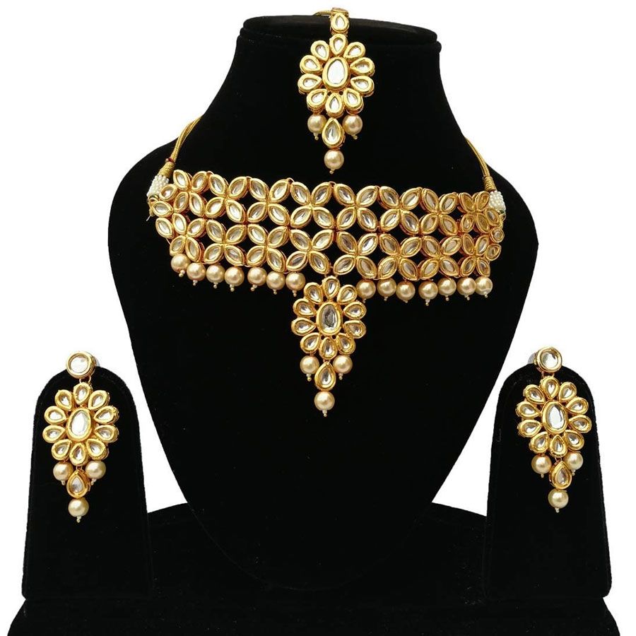Gold Rodium Polish Green Necklace in Metal Alloy with Kundan