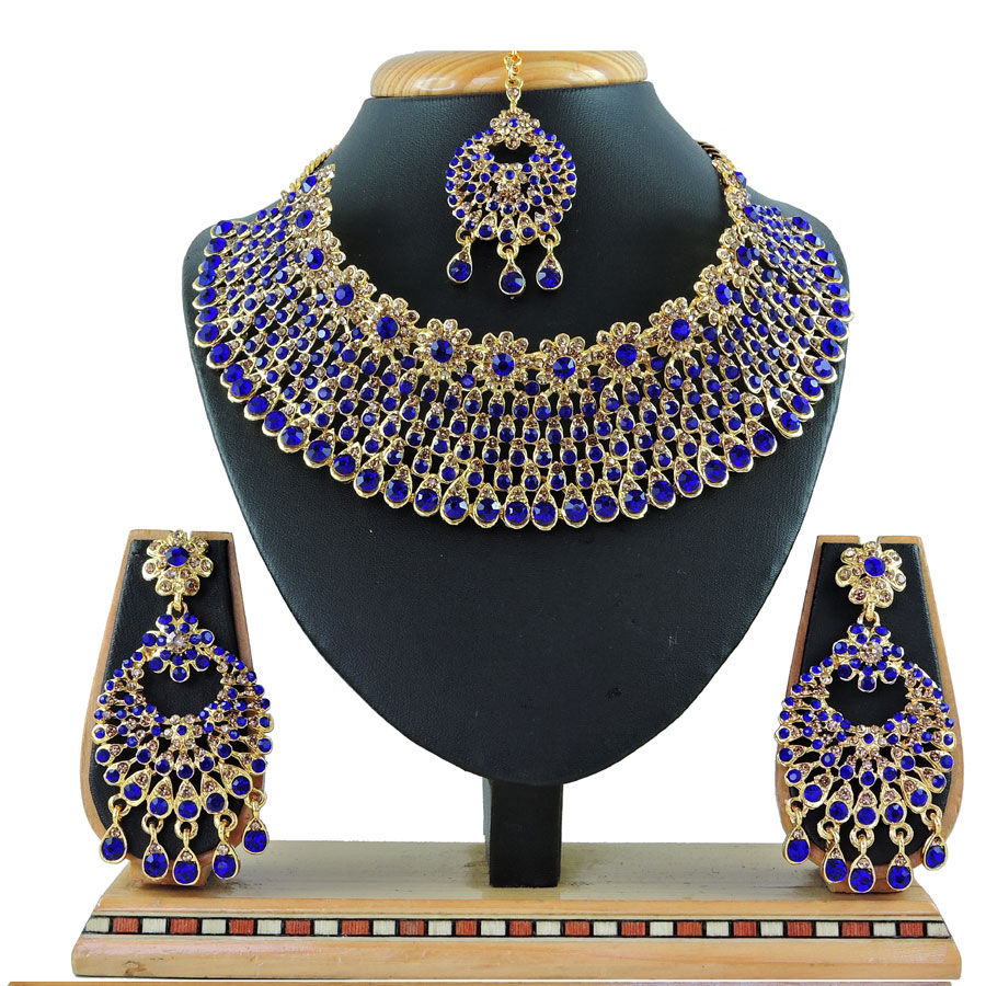 Gold Rodium Polish Blue, Gold color Necklace in Metal Alloy studded with CZ Diamond
