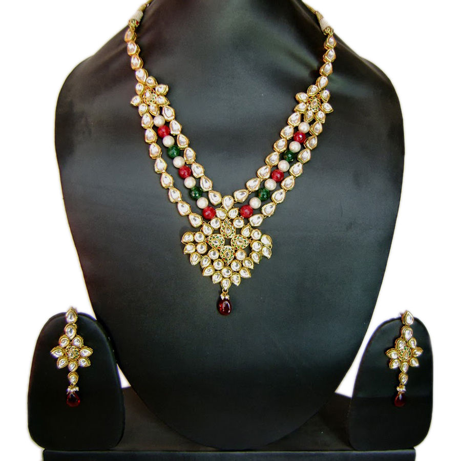 Gold Rodium Polish Gold, Green, Red and Maroon color Necklace in Metal Alloy studded with Beads, Kundan