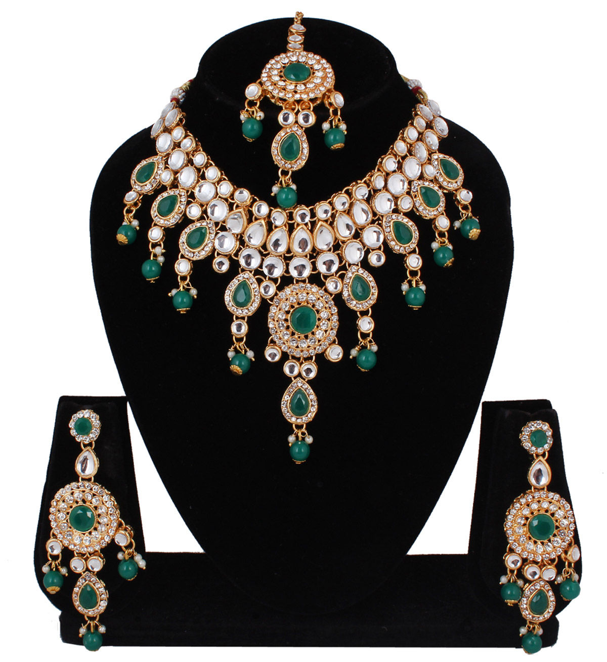 Gold Rodium Polish Green color Necklace in Metal Alloy studded with Austrian diamond, Kundan